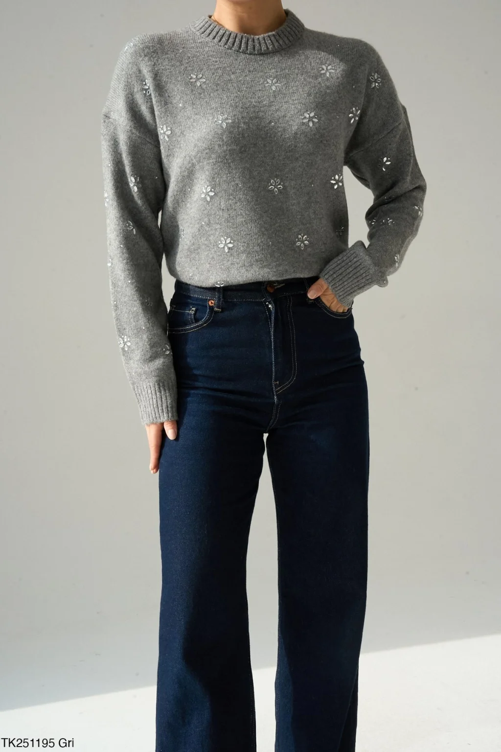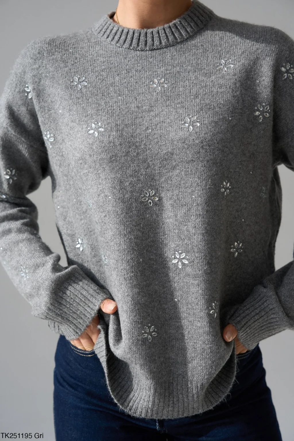 Bisiklet yaka, standart beden, çiçek desen taş detaylı gri kazak