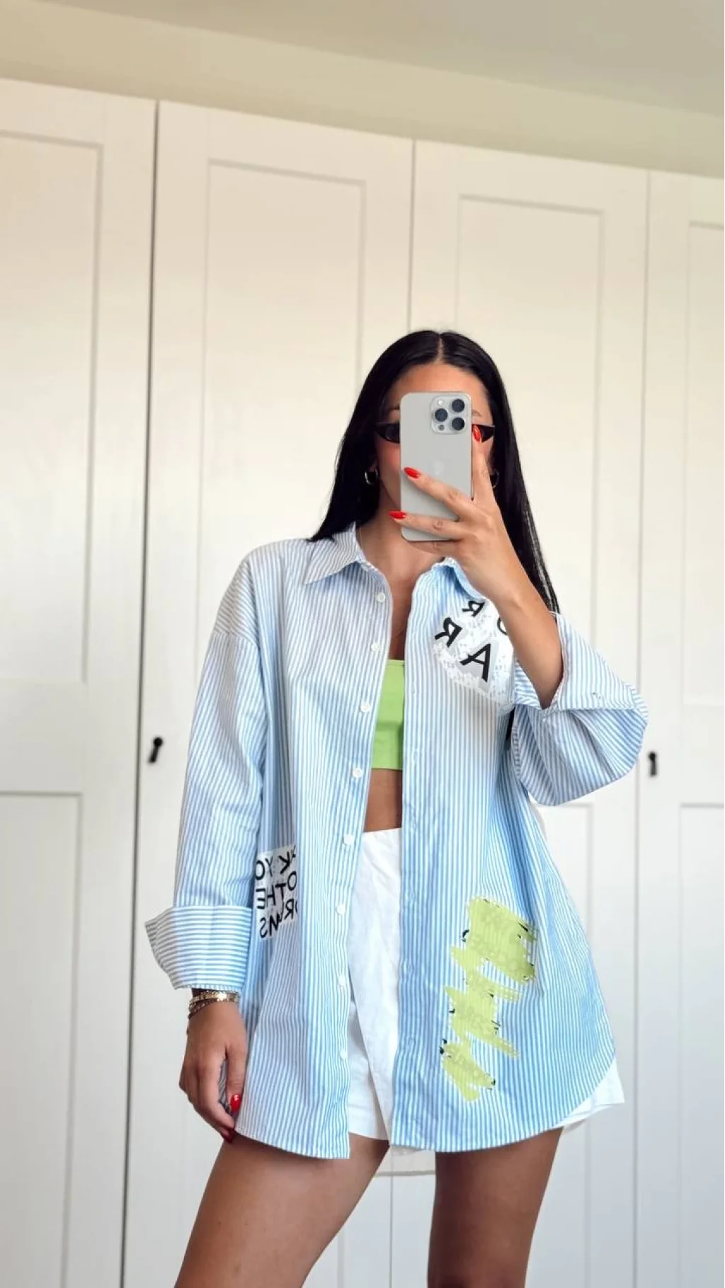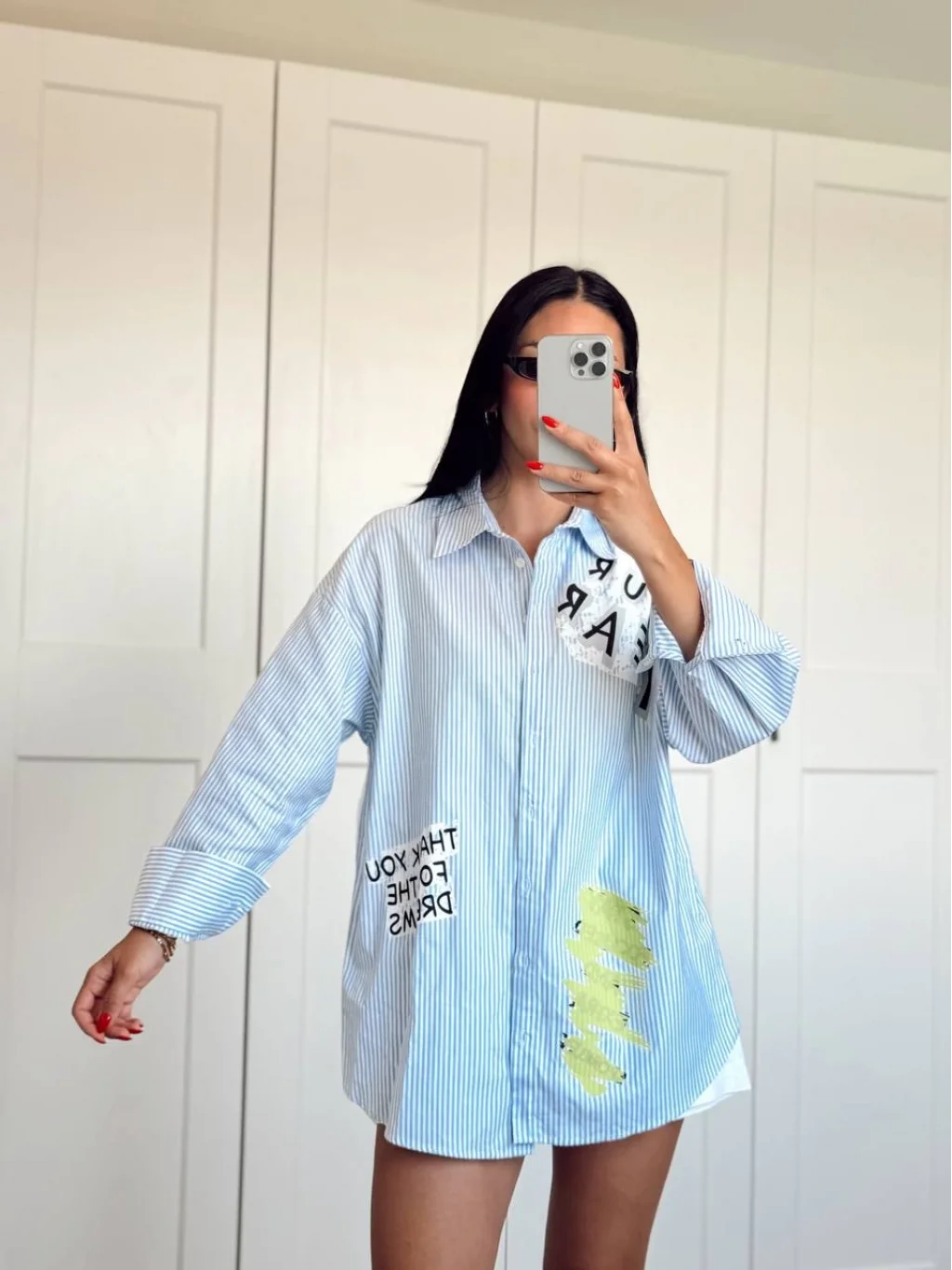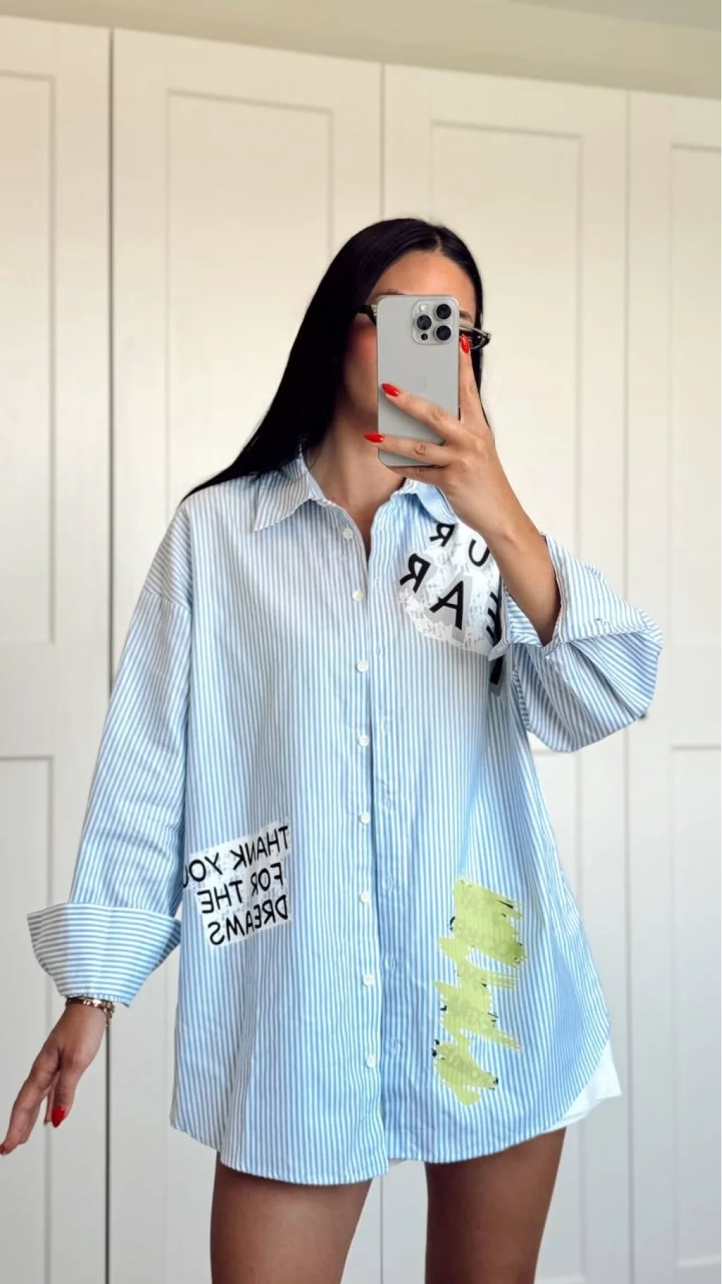 Çizgi Detaylı Baskılı Oversize Gömlek Mavi