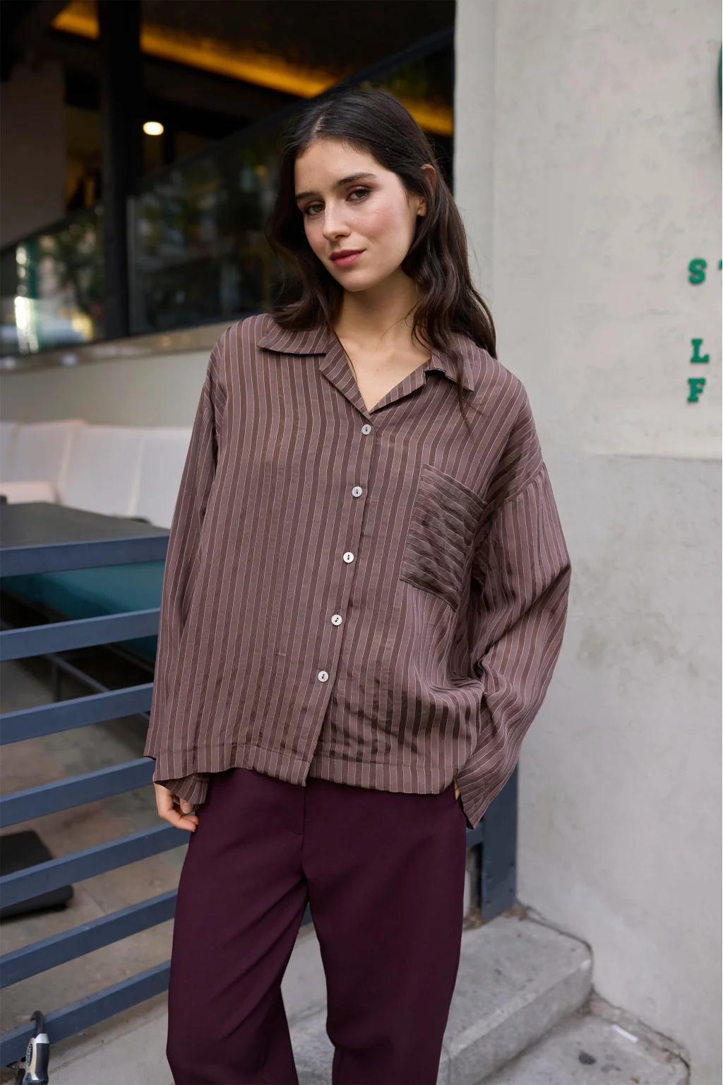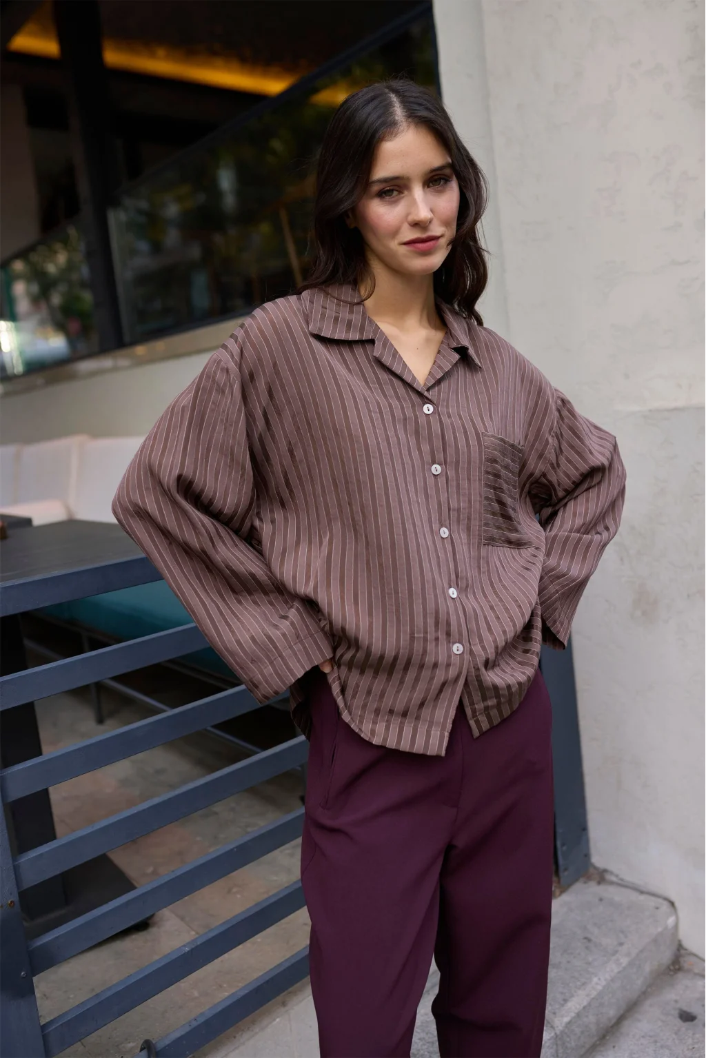 • MYRA'nın şık tasarımıyla öne çıkan Çizgili Kahverengi Oversize Gömlek, rahat ve şıklığı bir arada sunar.