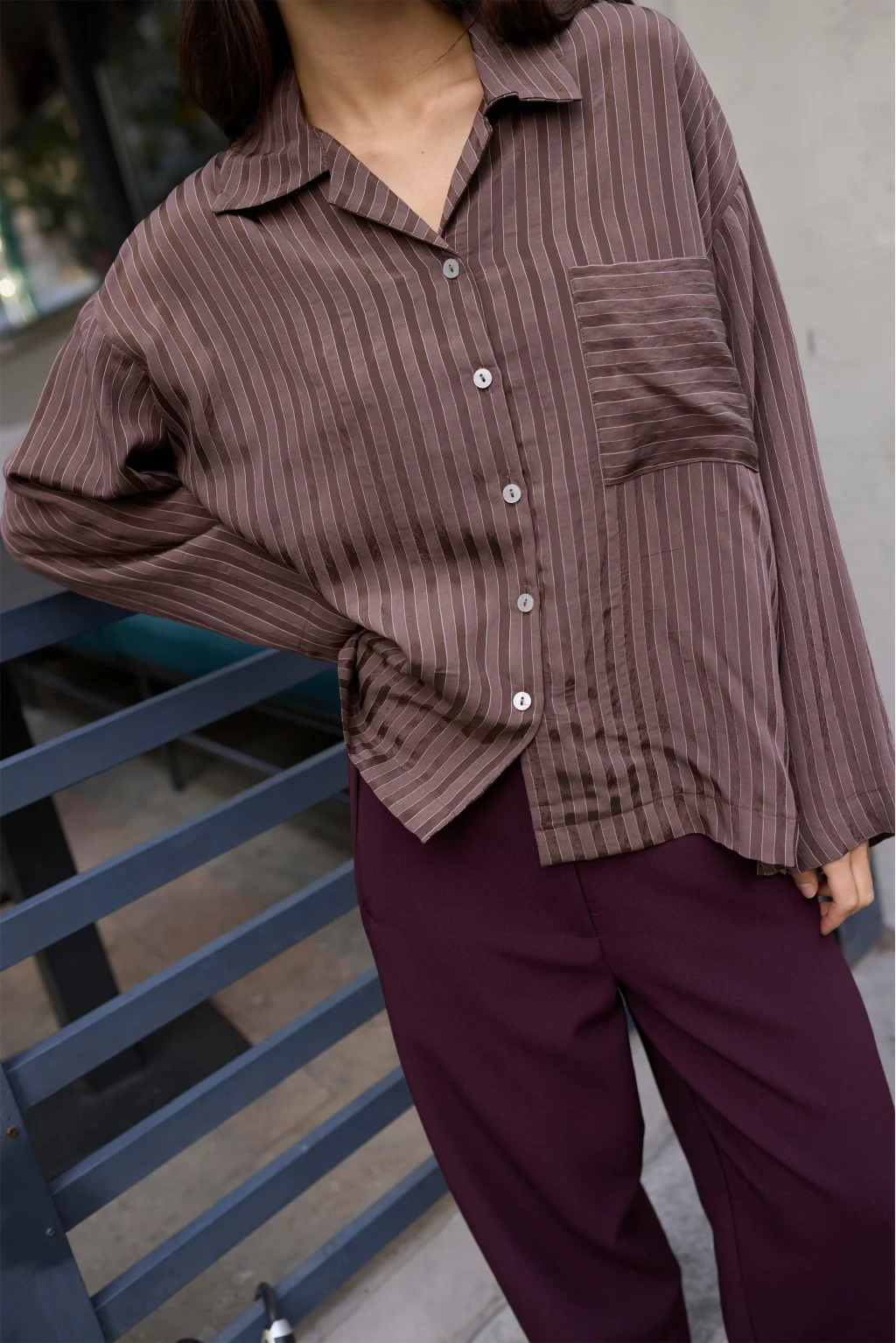 Standart beden, oversize kalıp, ön düğme kapamalı, çizgi detaylı kahverengi gömlek.