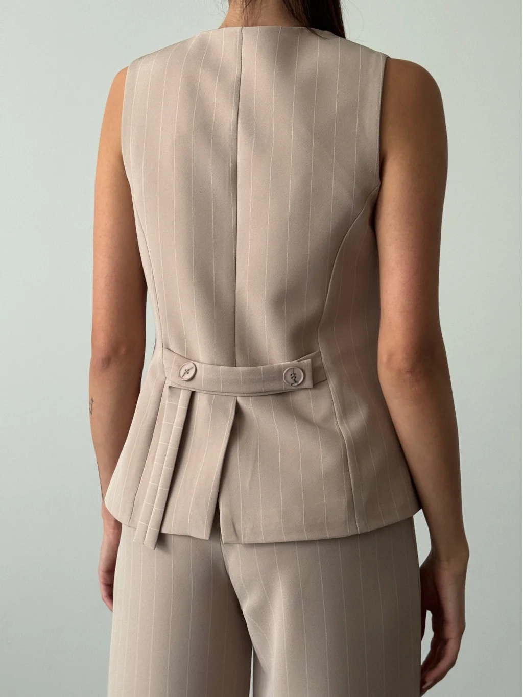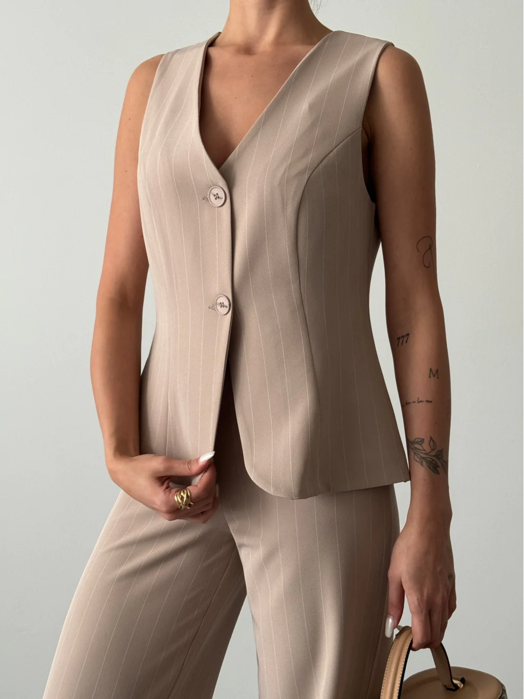 ÇİZGİLİ PAMUKLU YELEK PANTOLON TAKIM VİZON