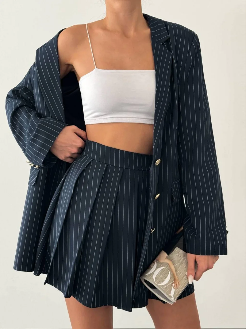 OVERSİZE ÇİZGİLİ POLİVİSKON ETEK CEKET TAKIM LACİVERT