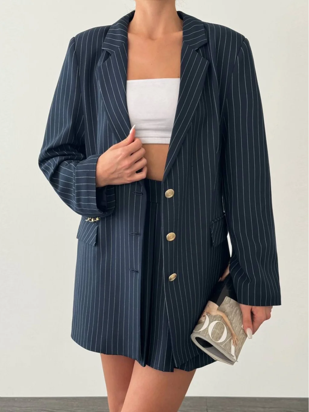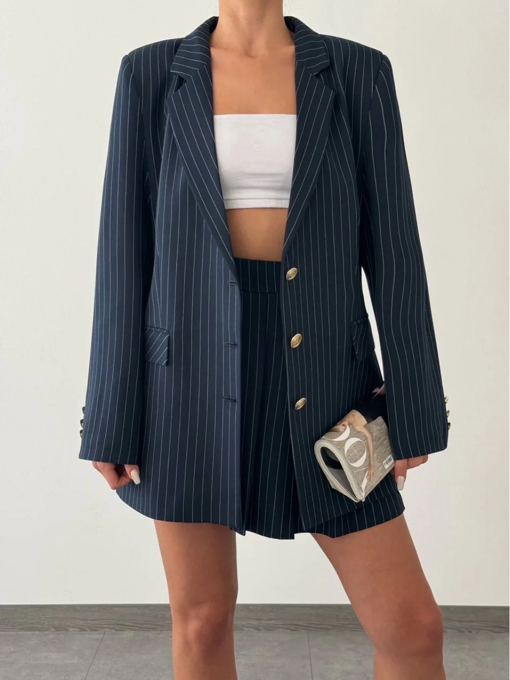 GOLD DÜĞME KAPAMALI ASTARLI LACİVERT ÜZERİNE BEYAZ ÇİZGİLİ CEKET
