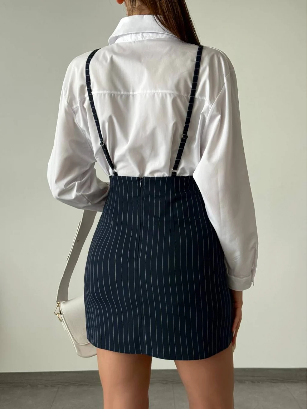 LACİVERT ÜZERİNE BEYAZ ÇİZGİLİ CROP CEKET VE JİLE ETEK TAKIM