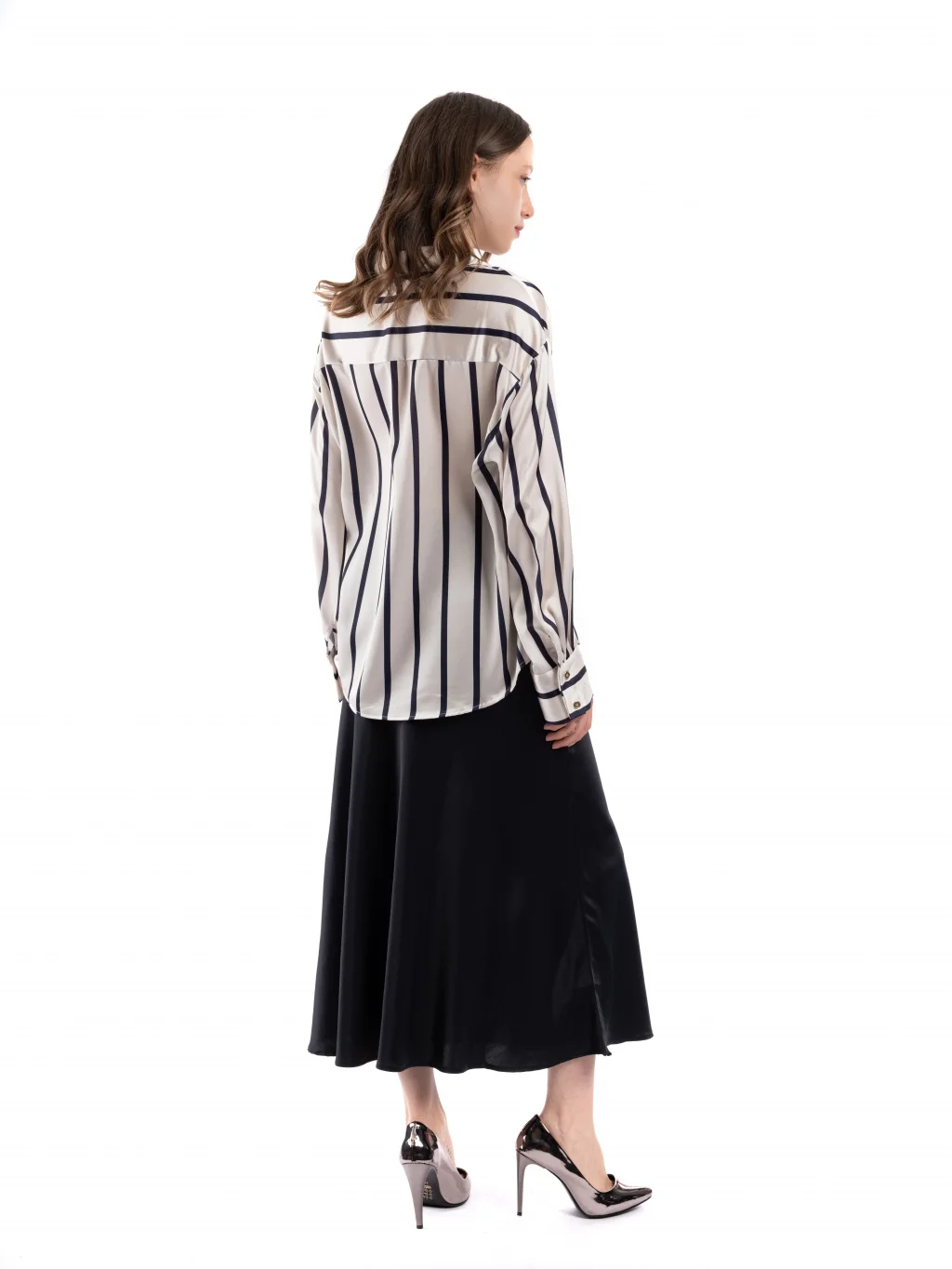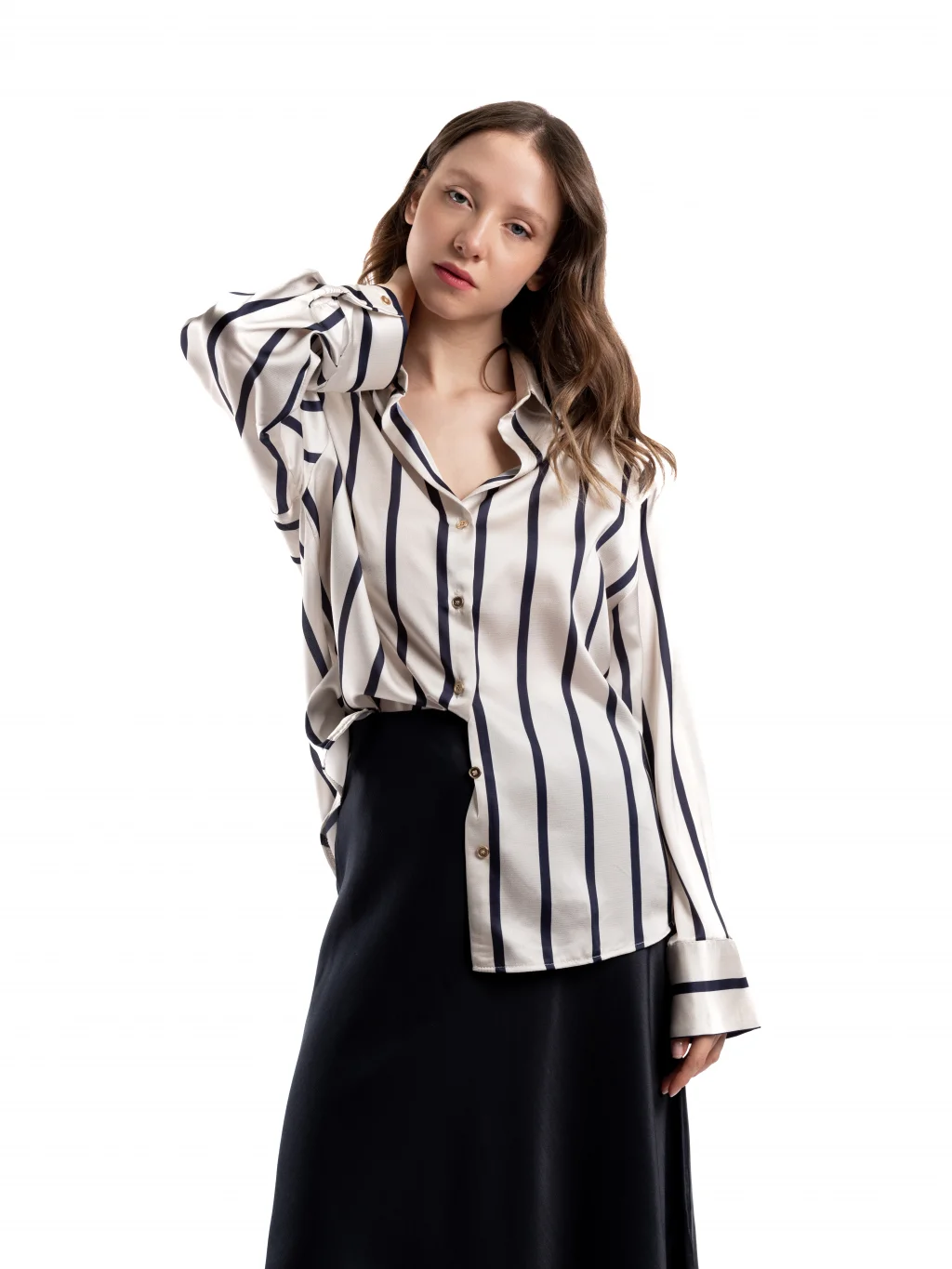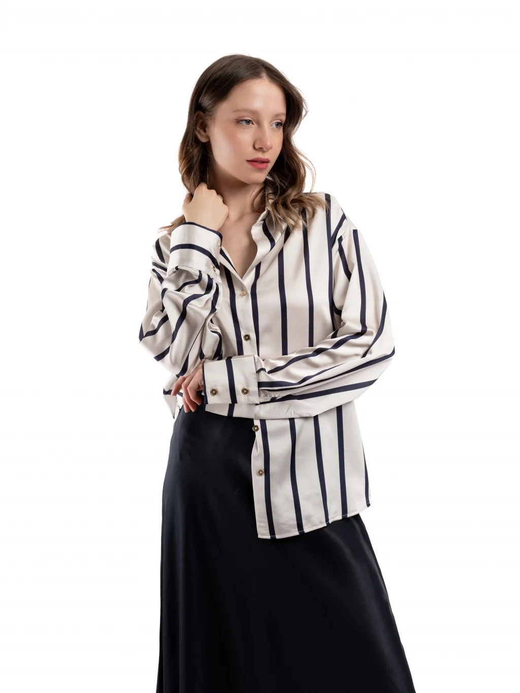 Krem Üstüne Lacivert Çizgili Oversize Marka Muadili Saten Gömlek
