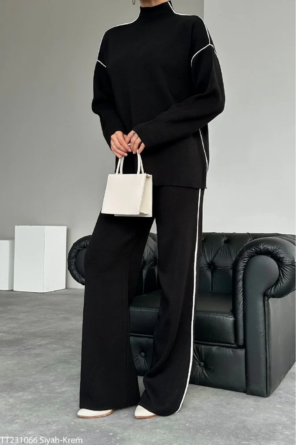 SİYAH BALIKÇI YAKA YANLARI BEYAZ ÇİZGİLİ KAZAK PANTOLON TAKIM