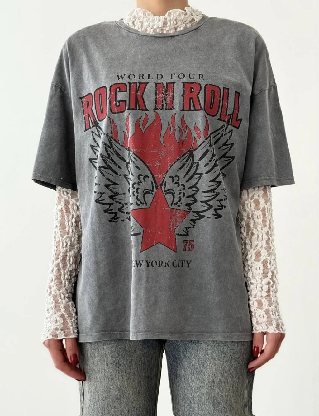 Ön kısmı baskılı, bisiklet yaka, kısa kollu, oversize kalıp, içerisindeki dantel üst çıkabilmektedir, yıkama detaylı tişört.