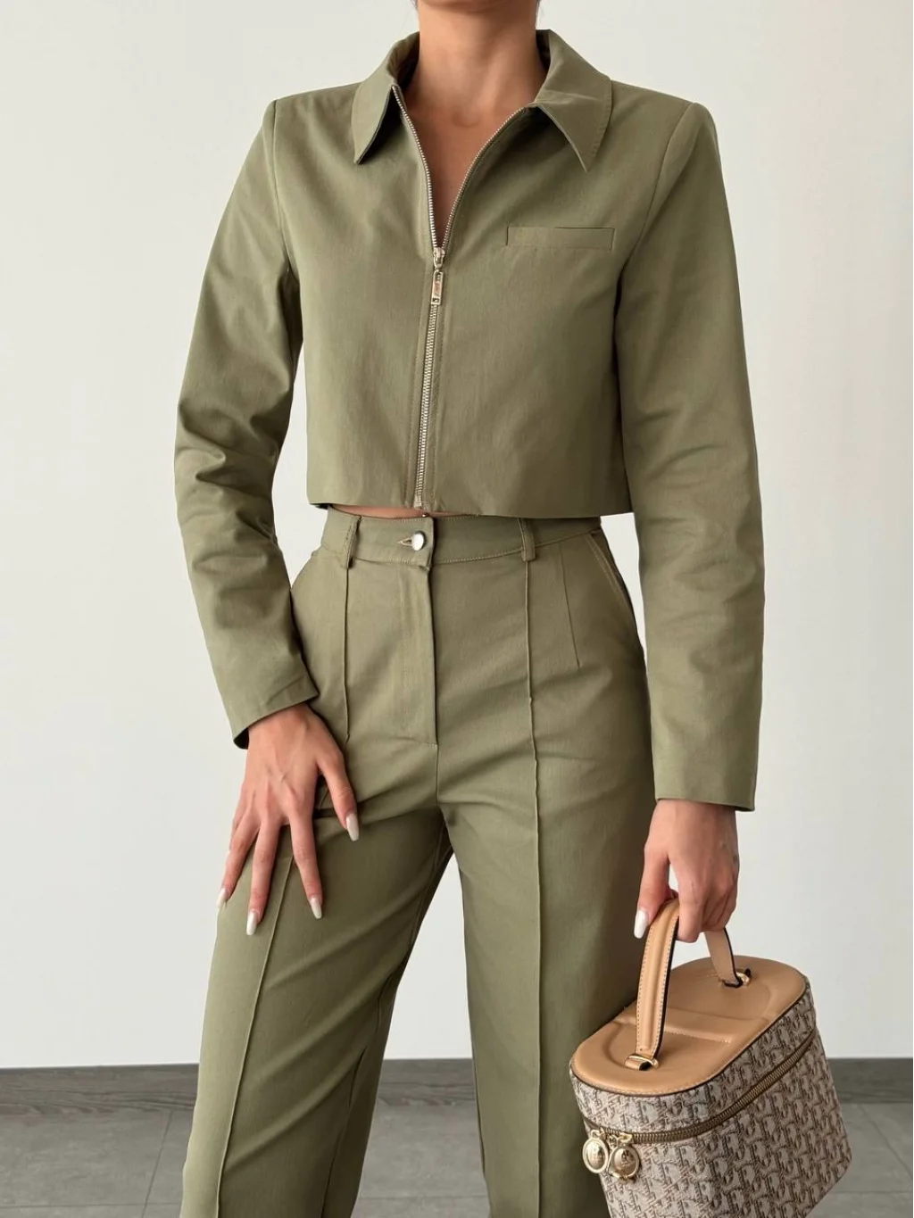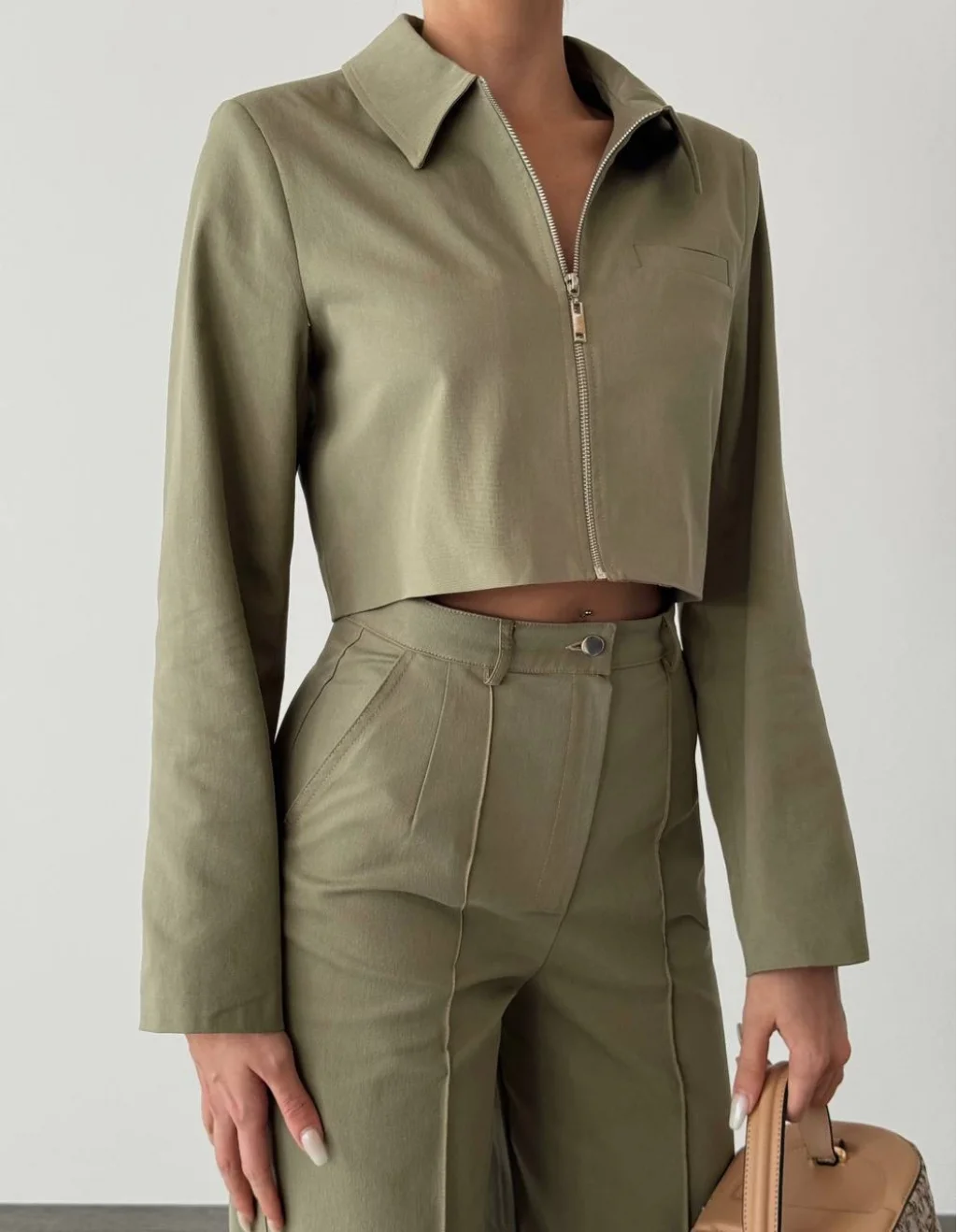 KATLI YAKALI ASTARLI FERMUAR KAPAMALI PAMUK KARIŞIMLI KUMAŞ CROP CEKET