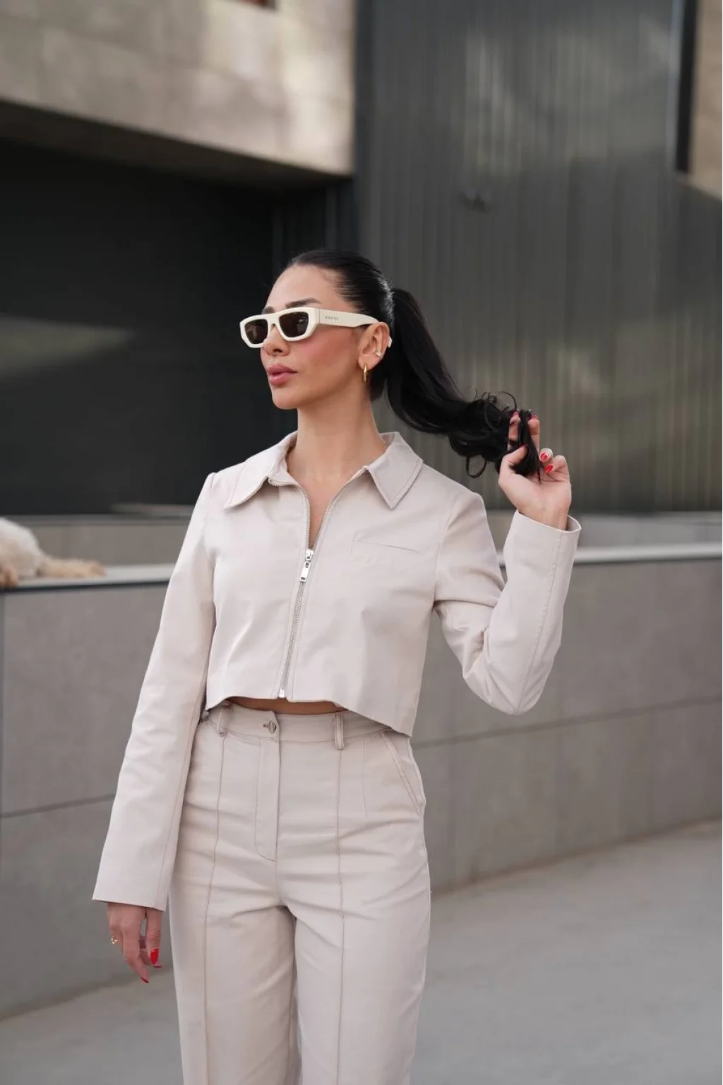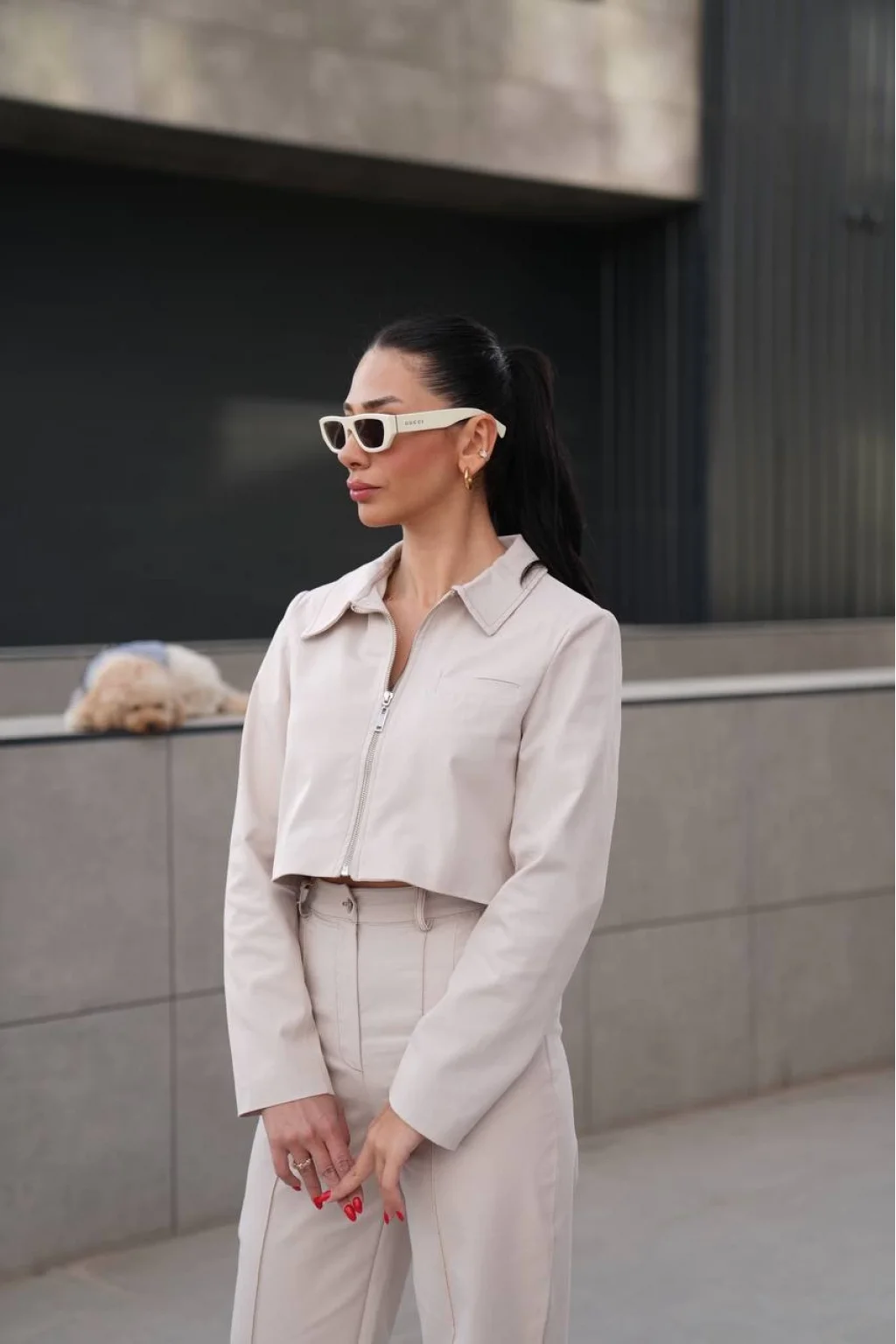 KATLI YAKALI ASTARLI FERMUAR KAPAMALI PAMUK KARIŞIMLI KUMAŞ CROP CEKET
