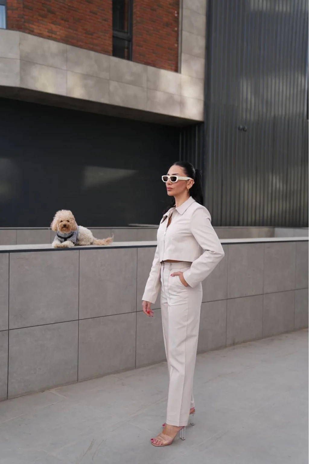 DENİM GABARDİN CEKET PANTOLON TAKIM KREM