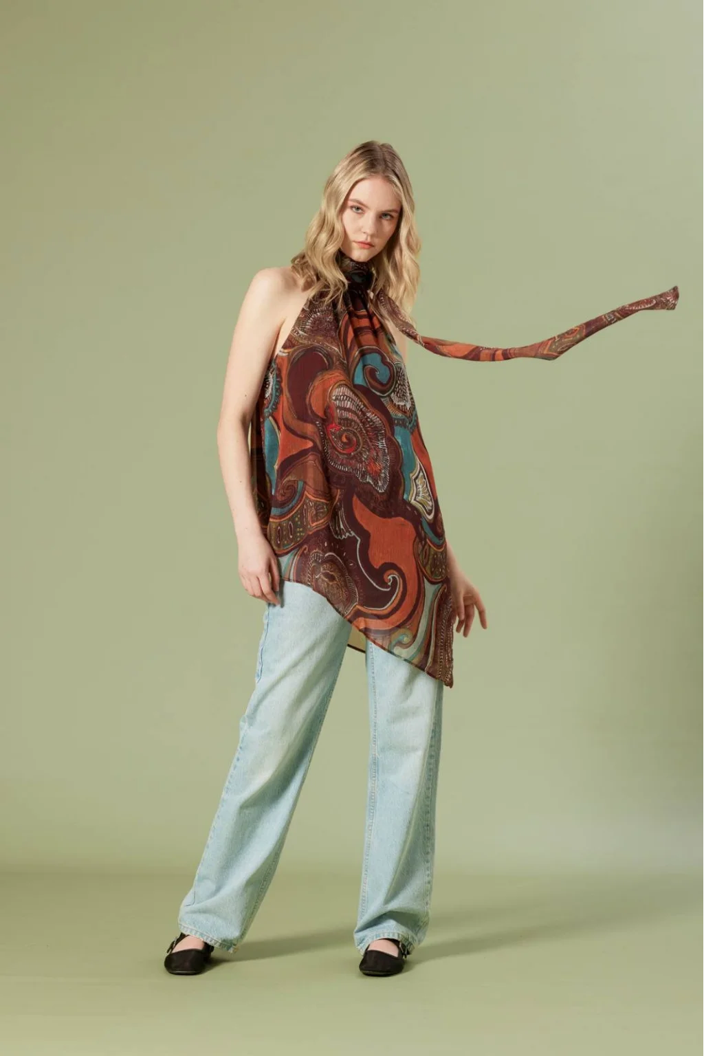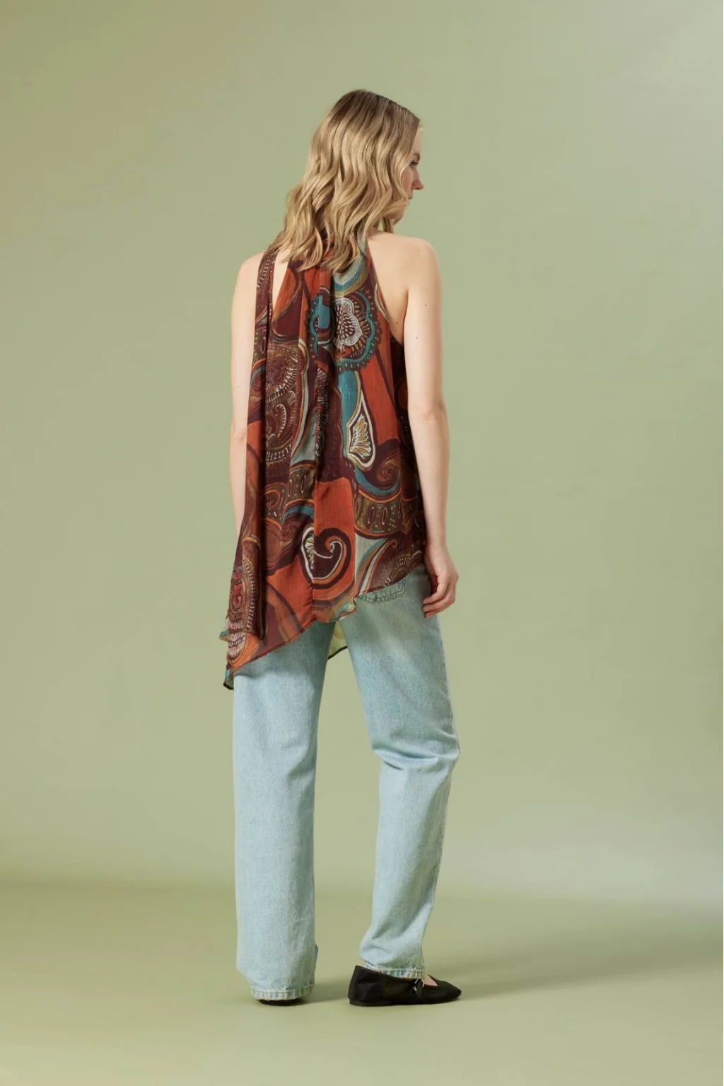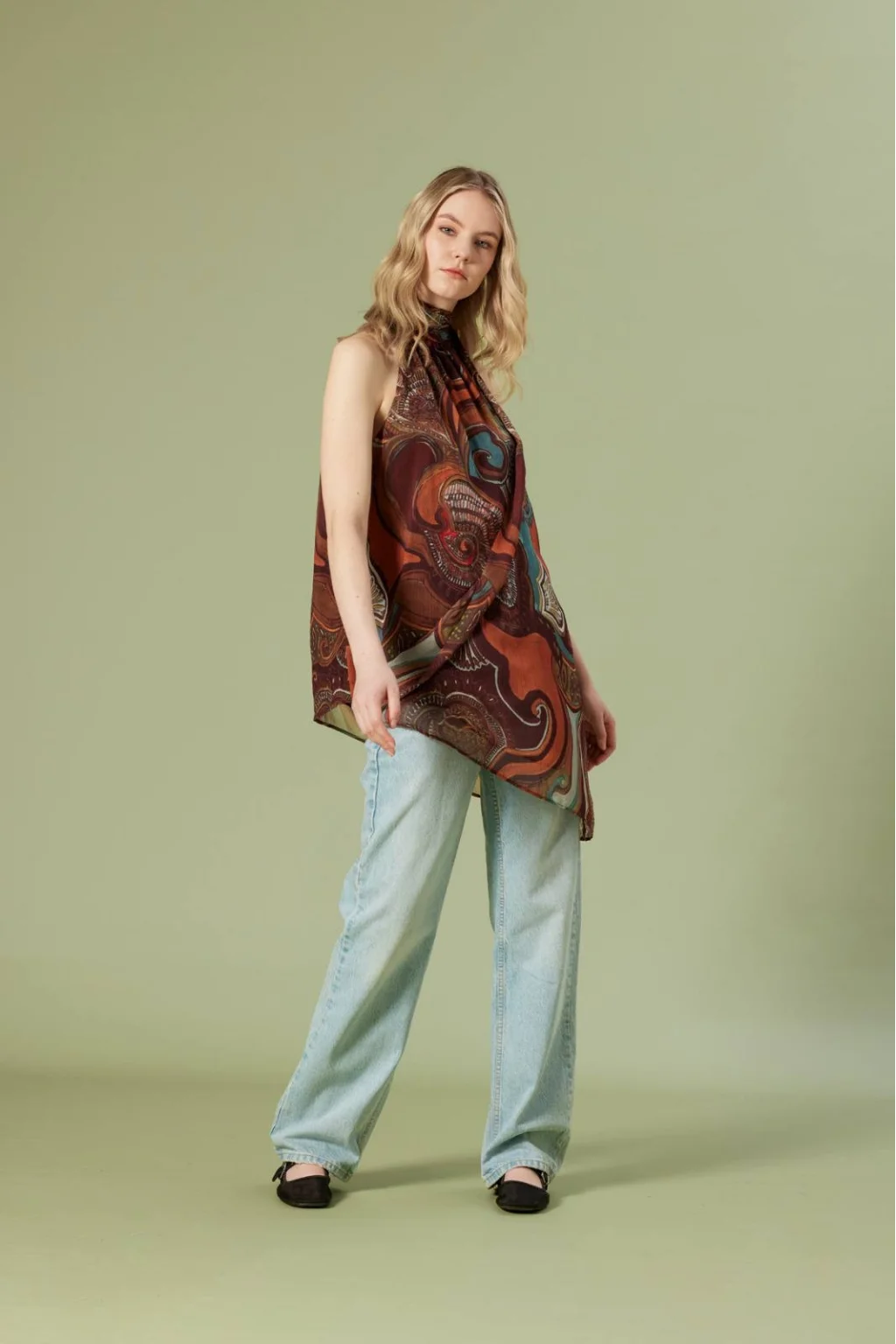 Boyundan bağlamalı,iç astarlı,rahat kalıp, kolsuz, desenli, asimetrik kesim bluz.