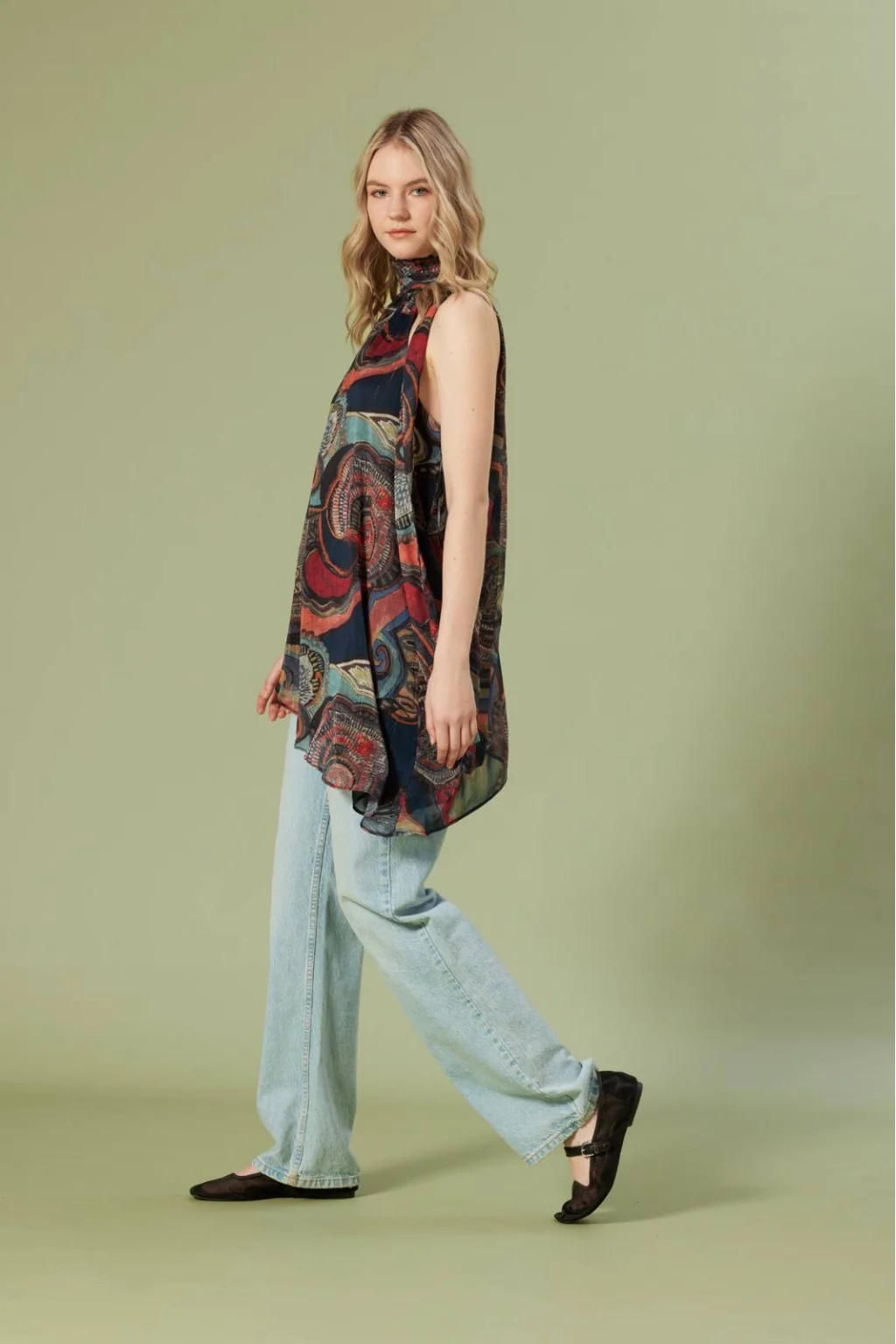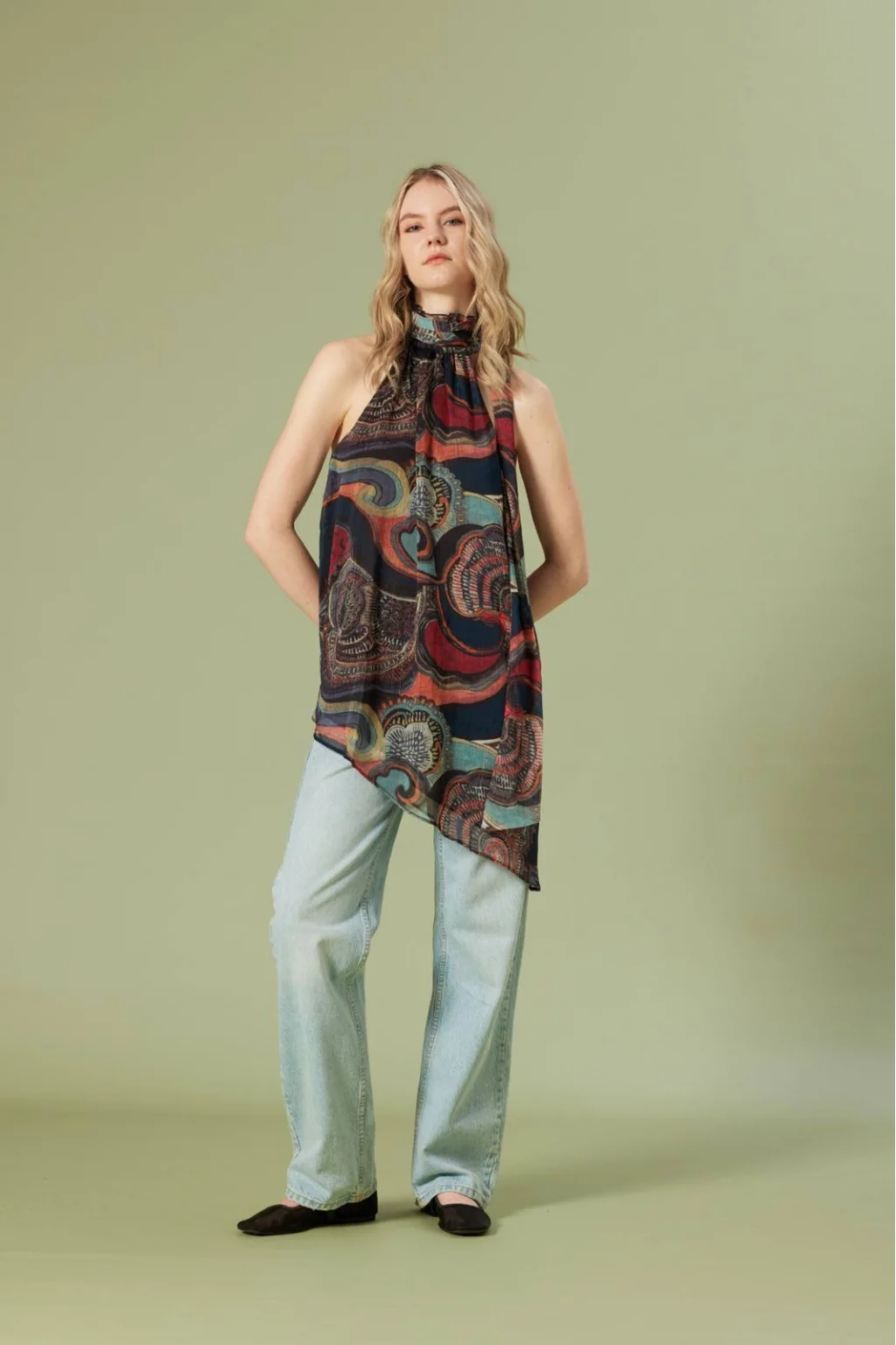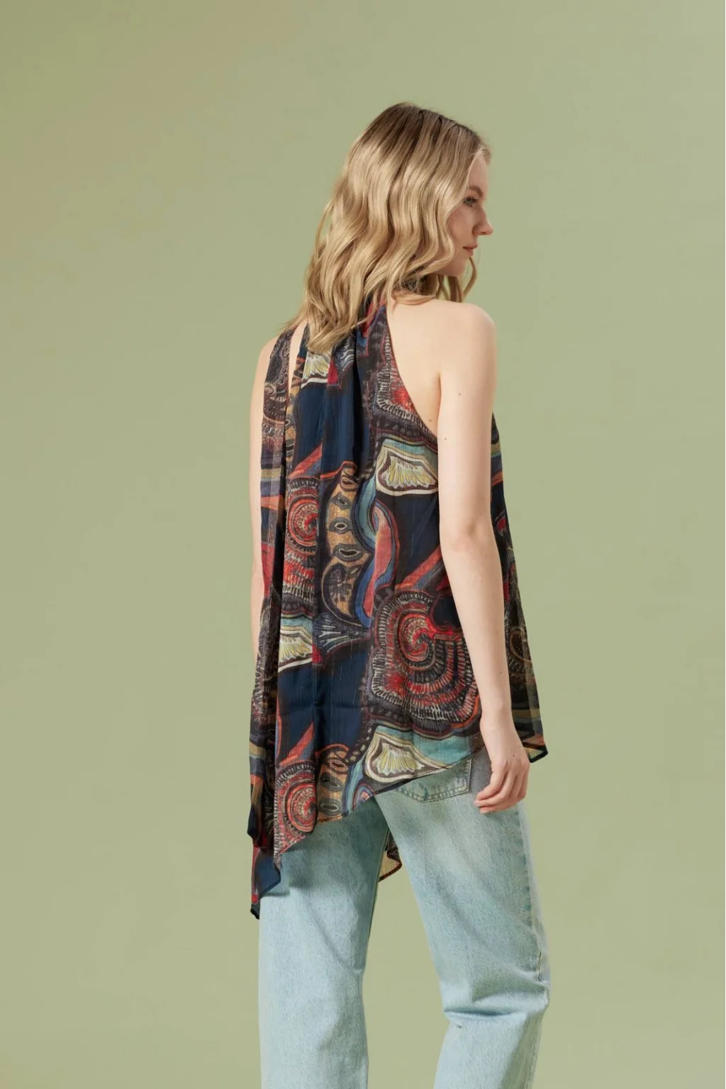 Boyundan bağlamalı,iç astarlı,rahat kalıp, kolsuz, desenli, asimetrik kesim bluz.