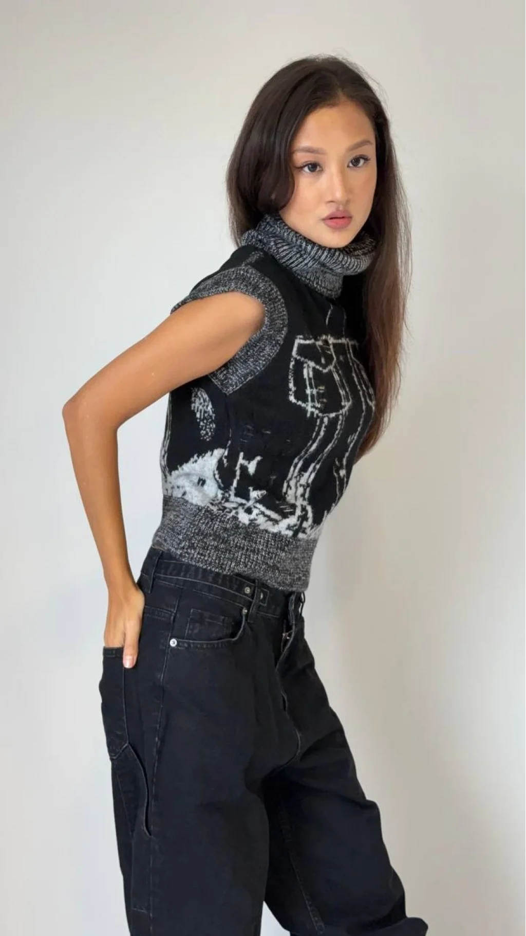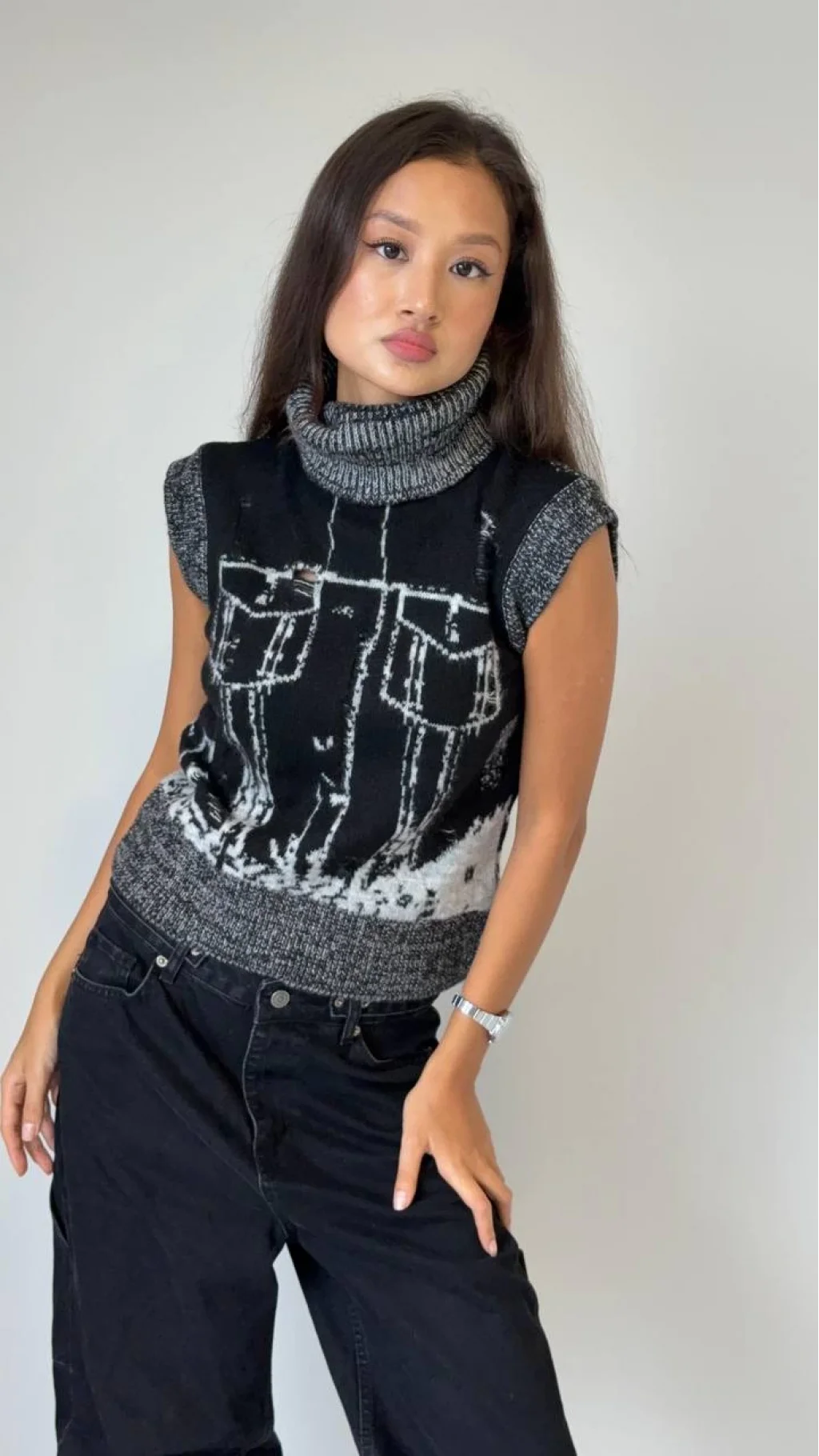 Balıkçı Yaka, Ön Yırtık Detaylı, Siyah Üzerine Gri Desenli Süveter