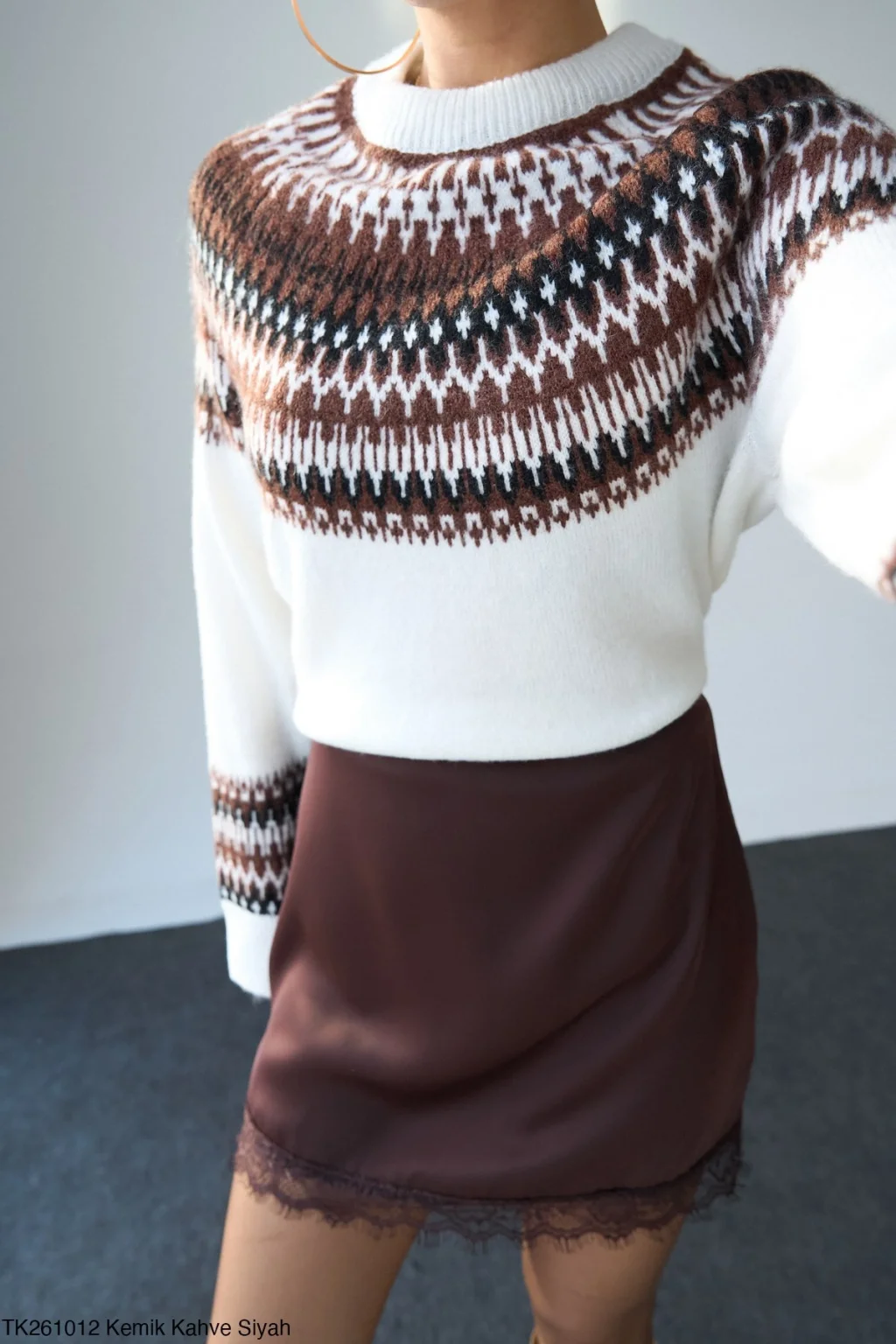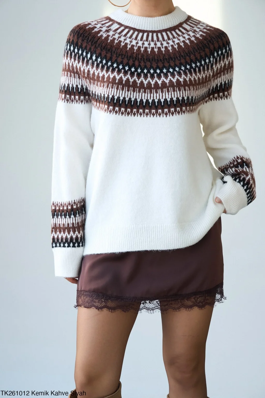 Standart beden bisiklet yaka desenli ekru kazak.