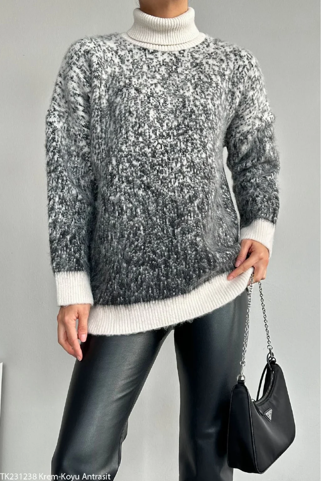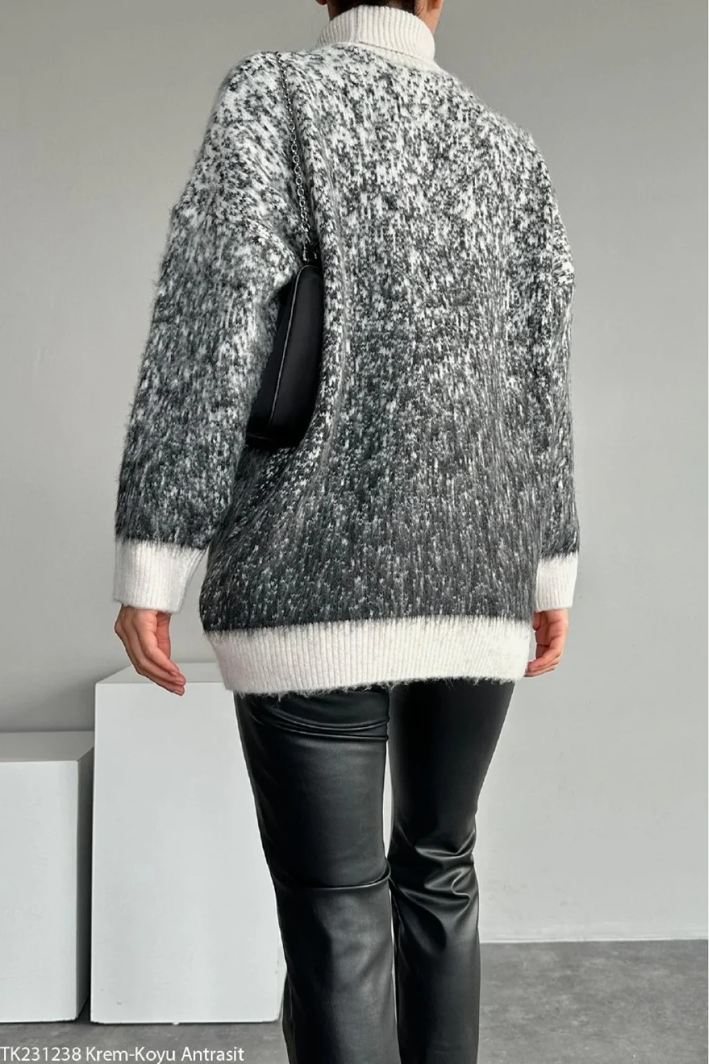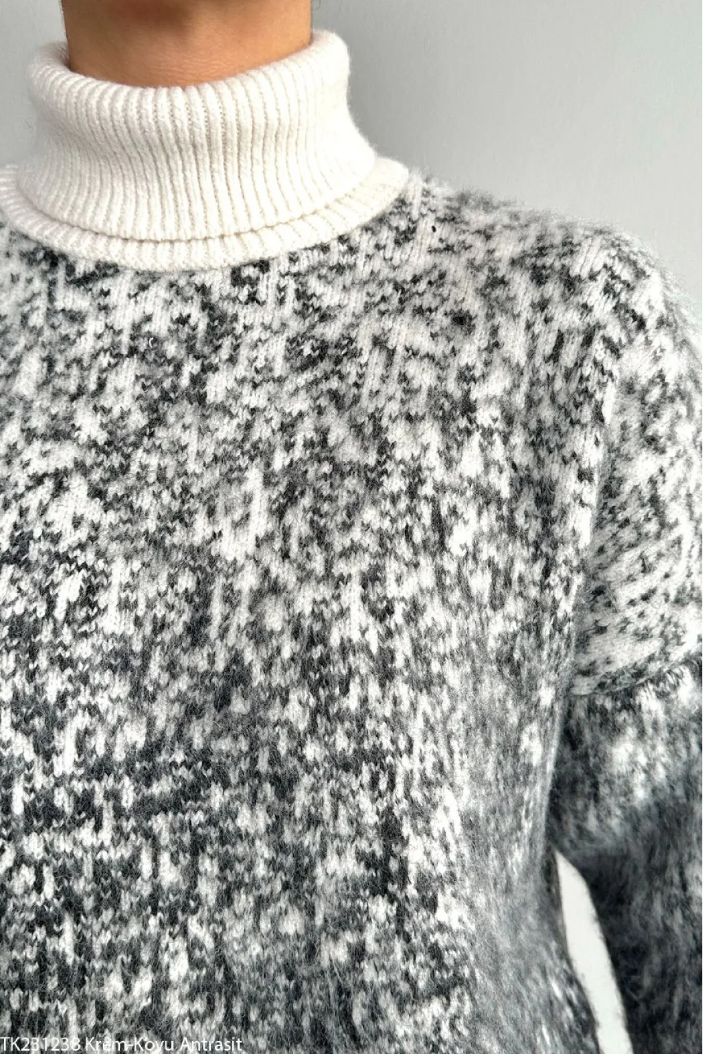 KARIŞIK DESENLİ ŞARDONLU BOĞAZLI KAZAK GRİ BEYAZ