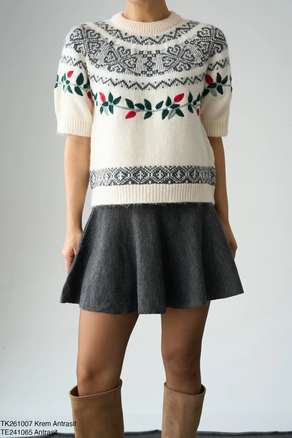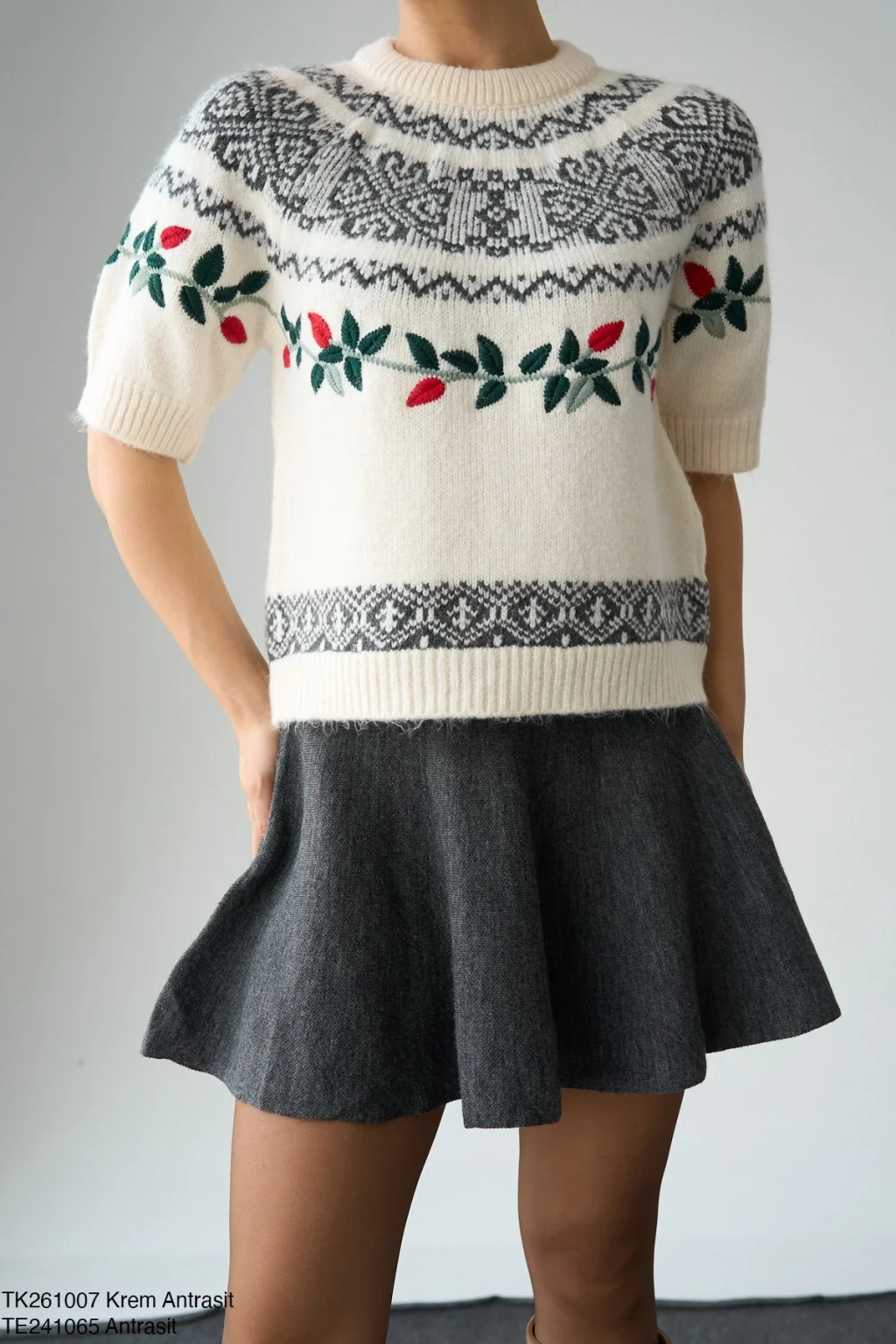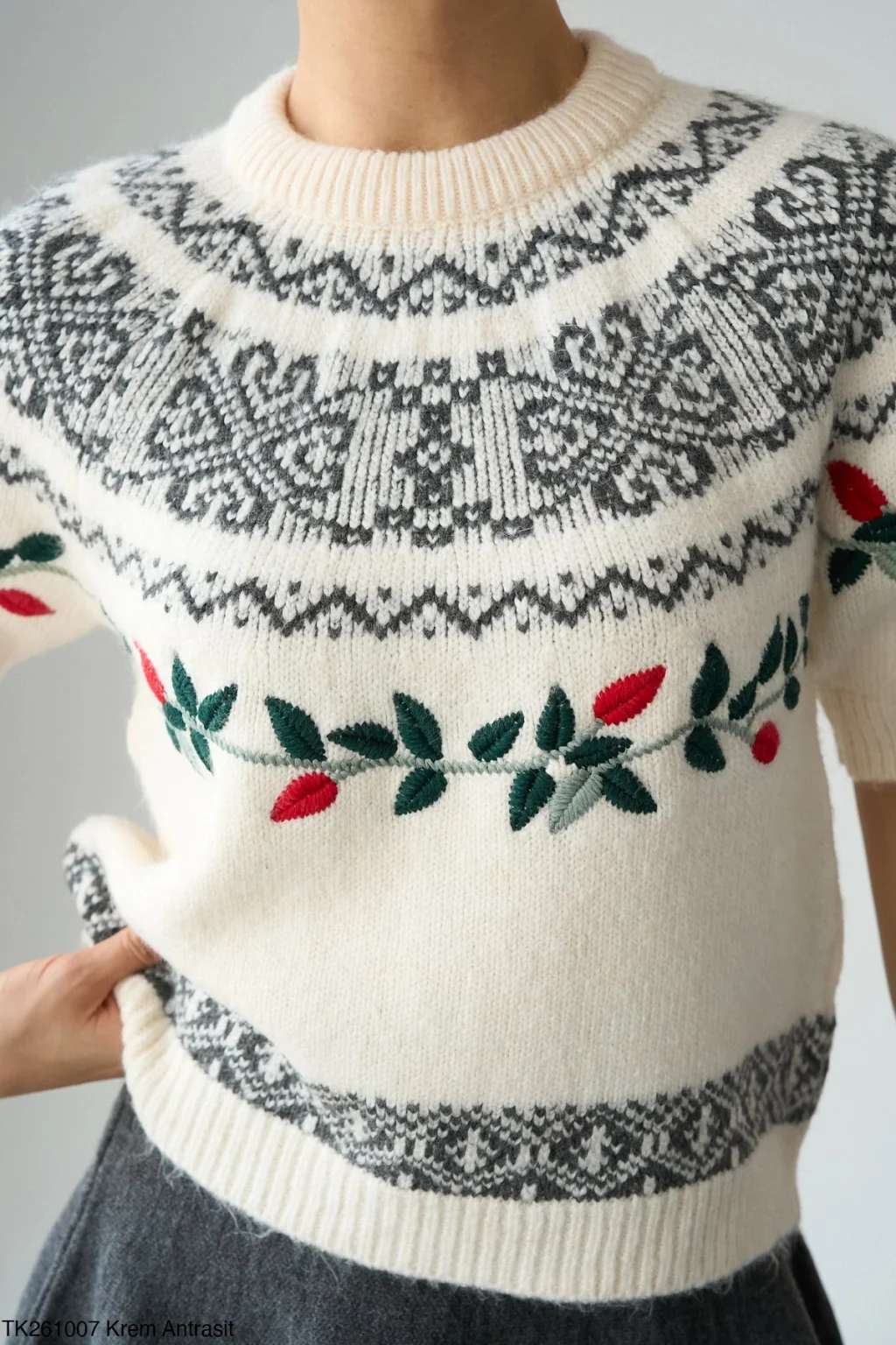 MYRA Desenli Kısa Kol Triko Kazak-Ekru, şıklığı ve rahatlığı bir arada sunar.