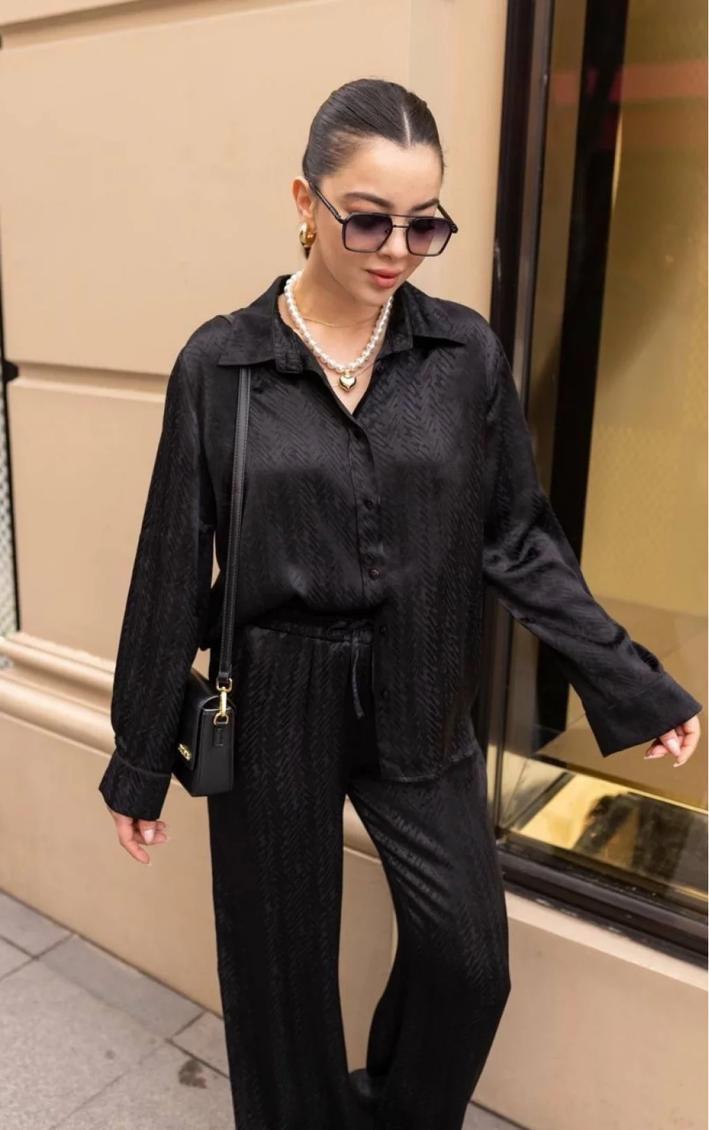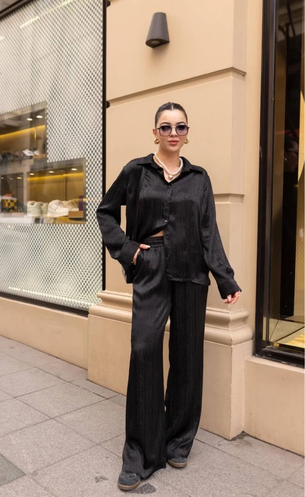 DESENLİ SATEN GÖMLEK PANTOLON TAKIM SİYAH