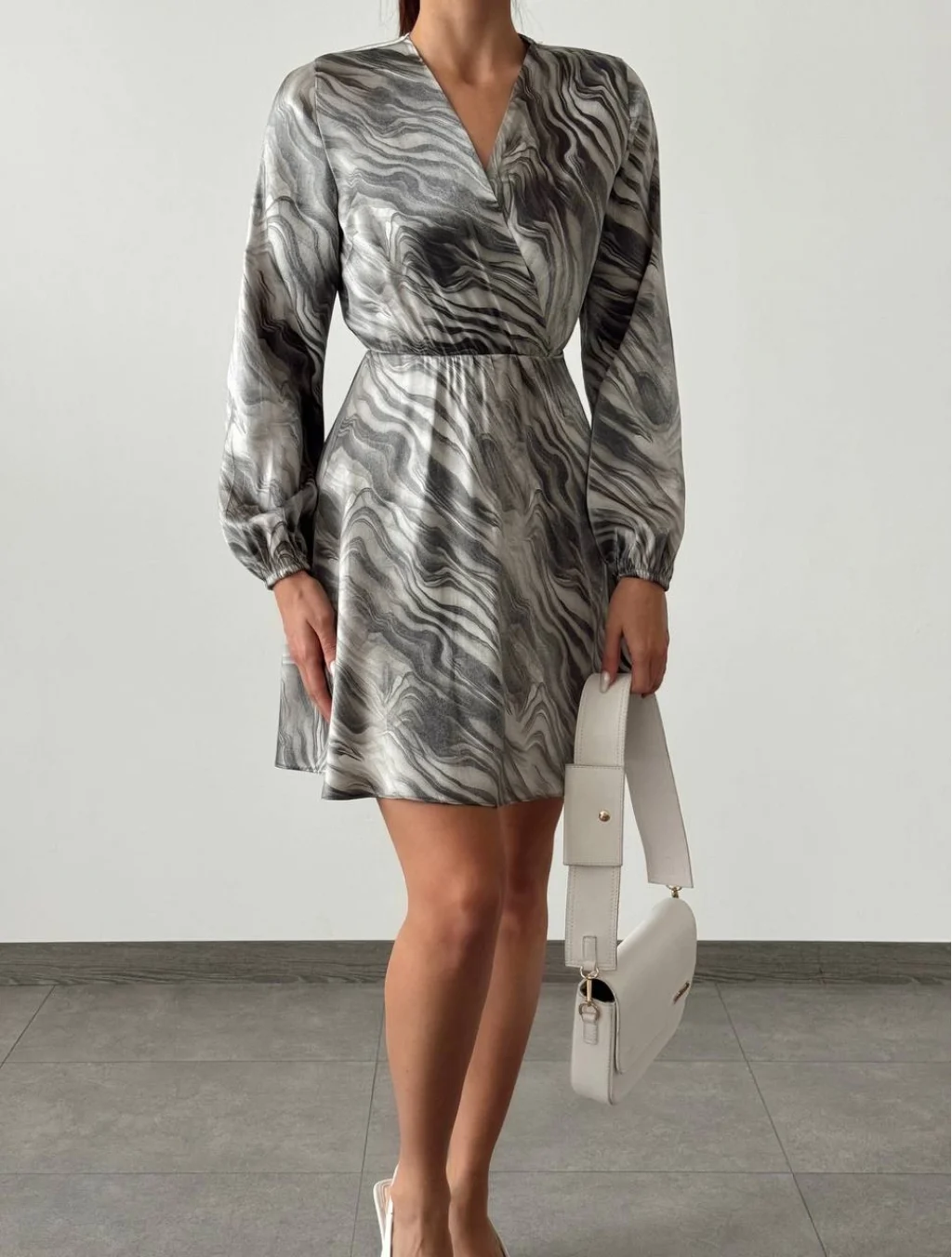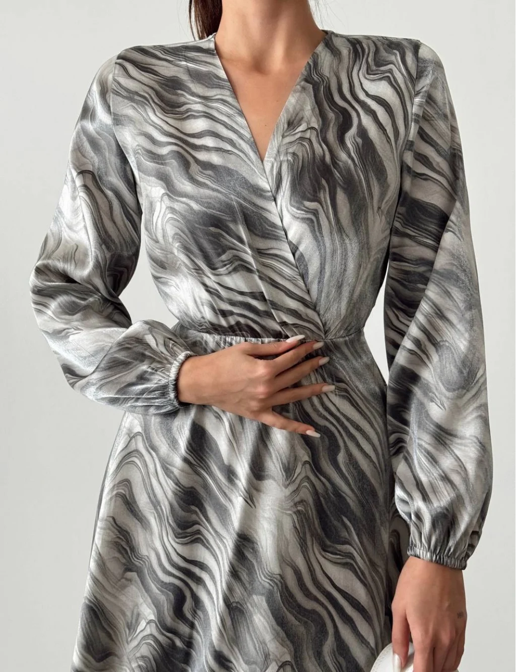 DESENLİ SATEN KRUVAZE ELBİSE SİYAH