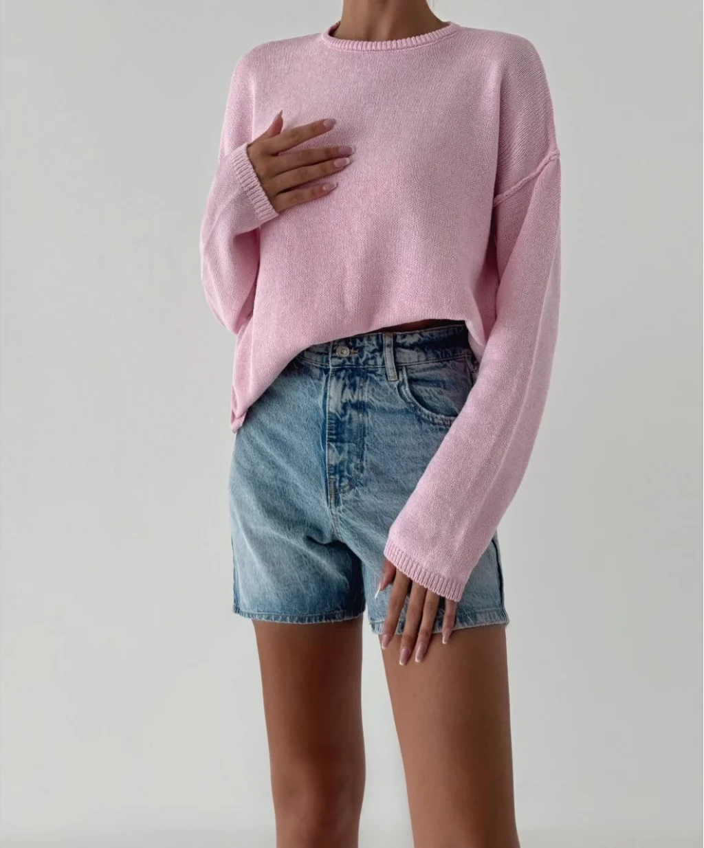 Omuz Dikiş Detaylı Pembe Triko Kazak