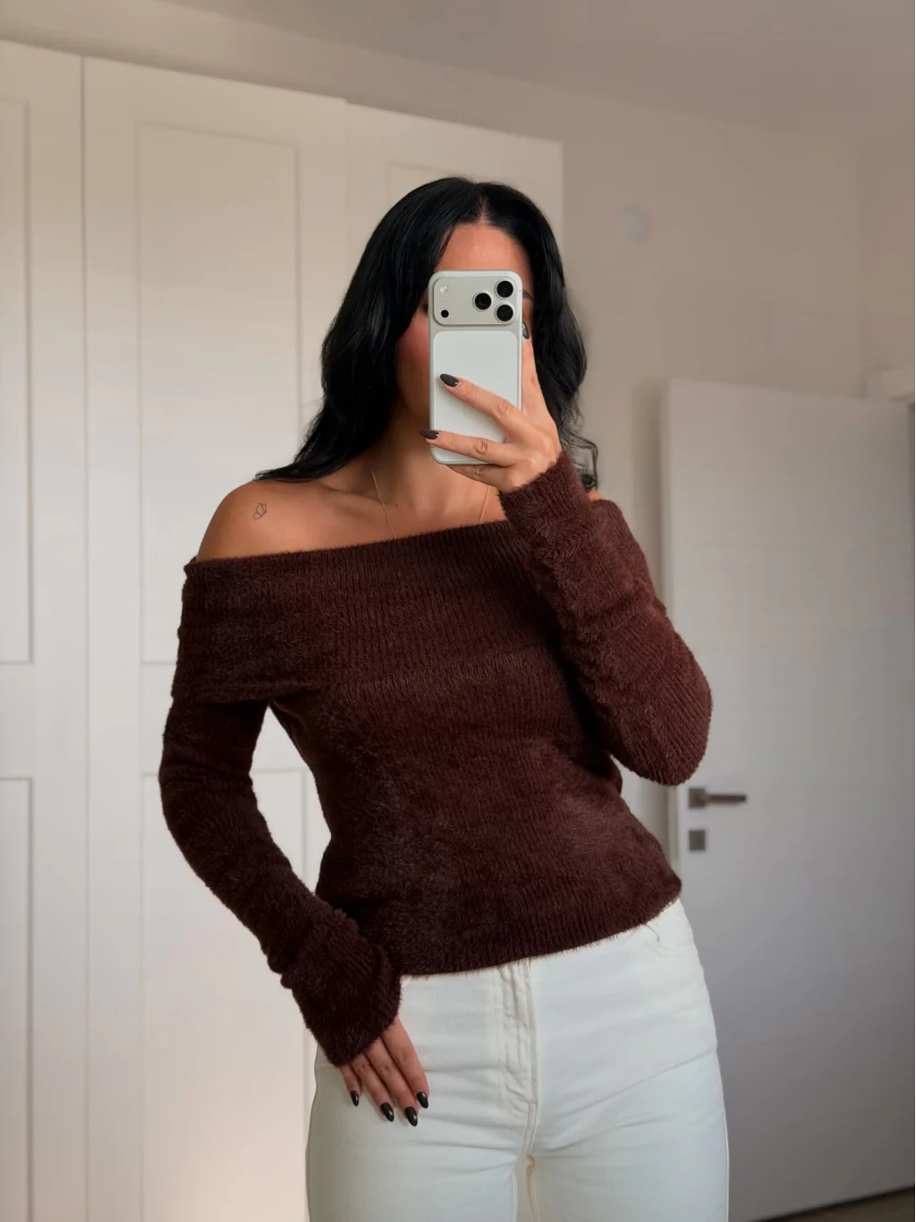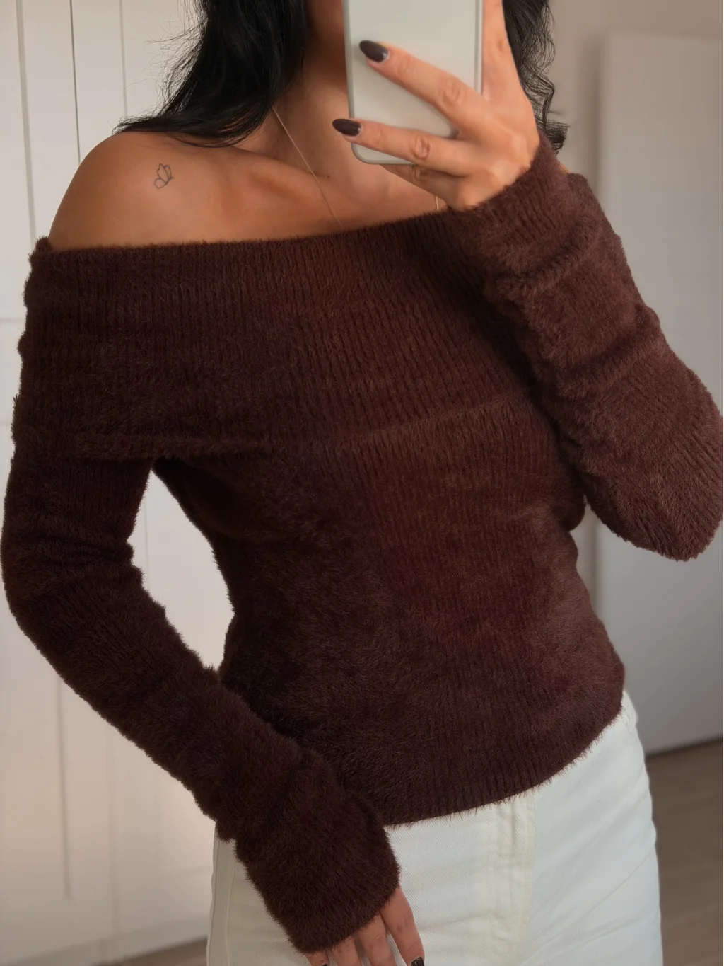 MYRA'nın kahverengi renkli Madonna yaka dokulu kazak, şıklığınızı ve sıcaklığınızı bir arada sunuyor.