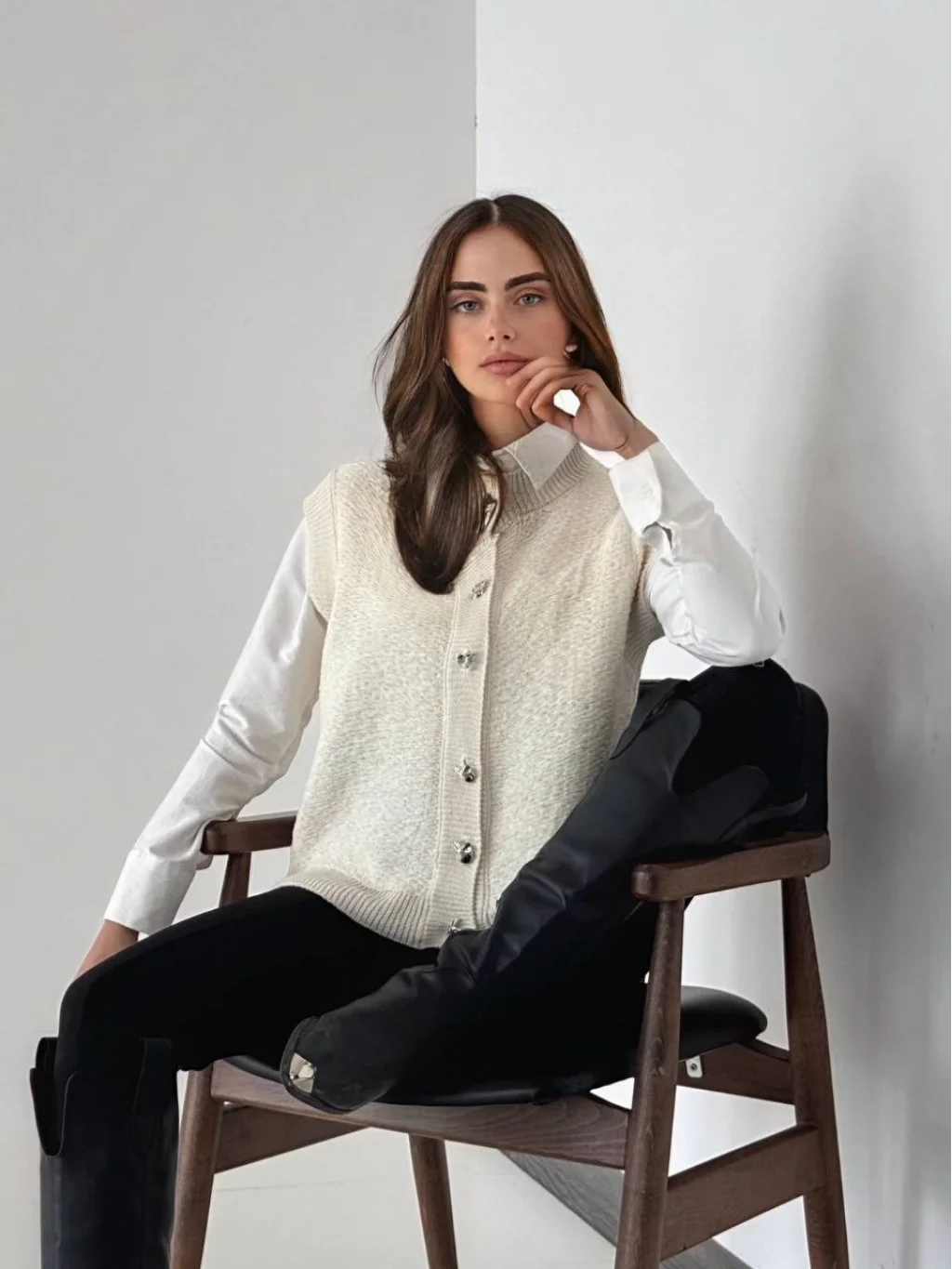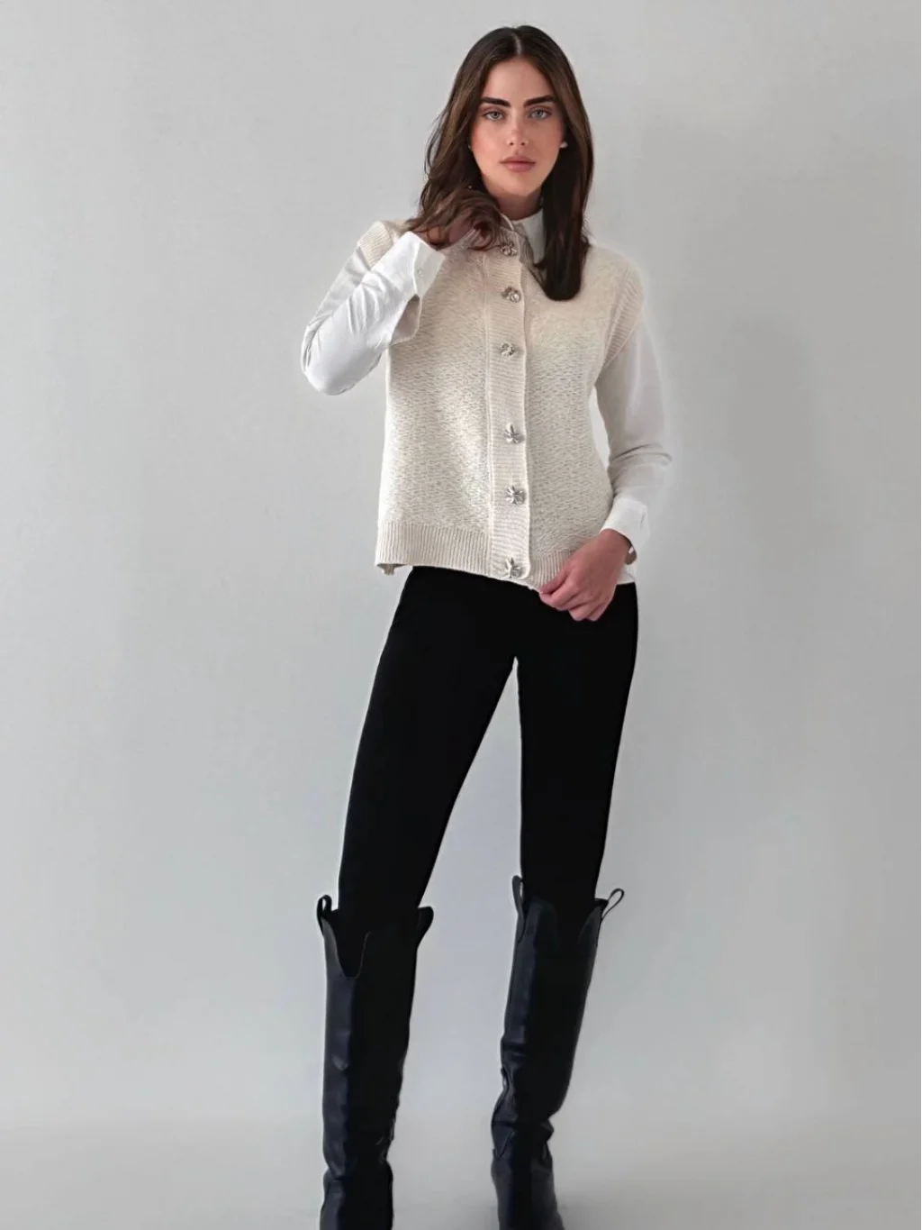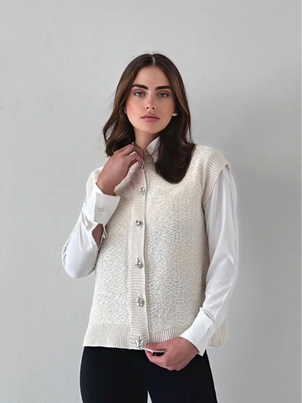 Standart Beden Gümüş Düğme Detay Örgü Doku Ekru Triko Yelek