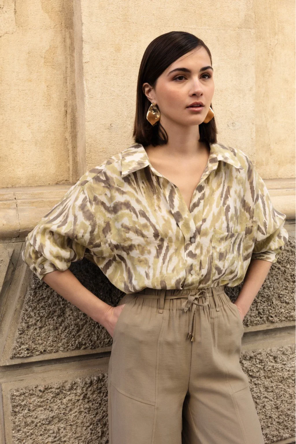 Modal Kumaş Oversize Kalıp Ön Düğme Kapamalı Tek CEpli Yeşil Desenli Premium Seri Gömlek