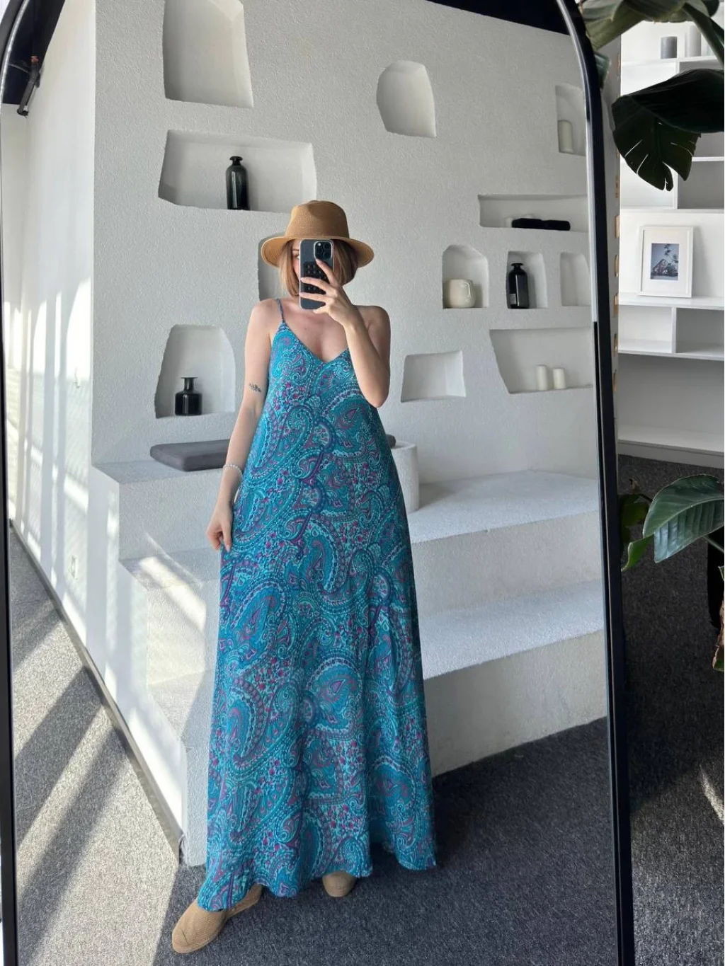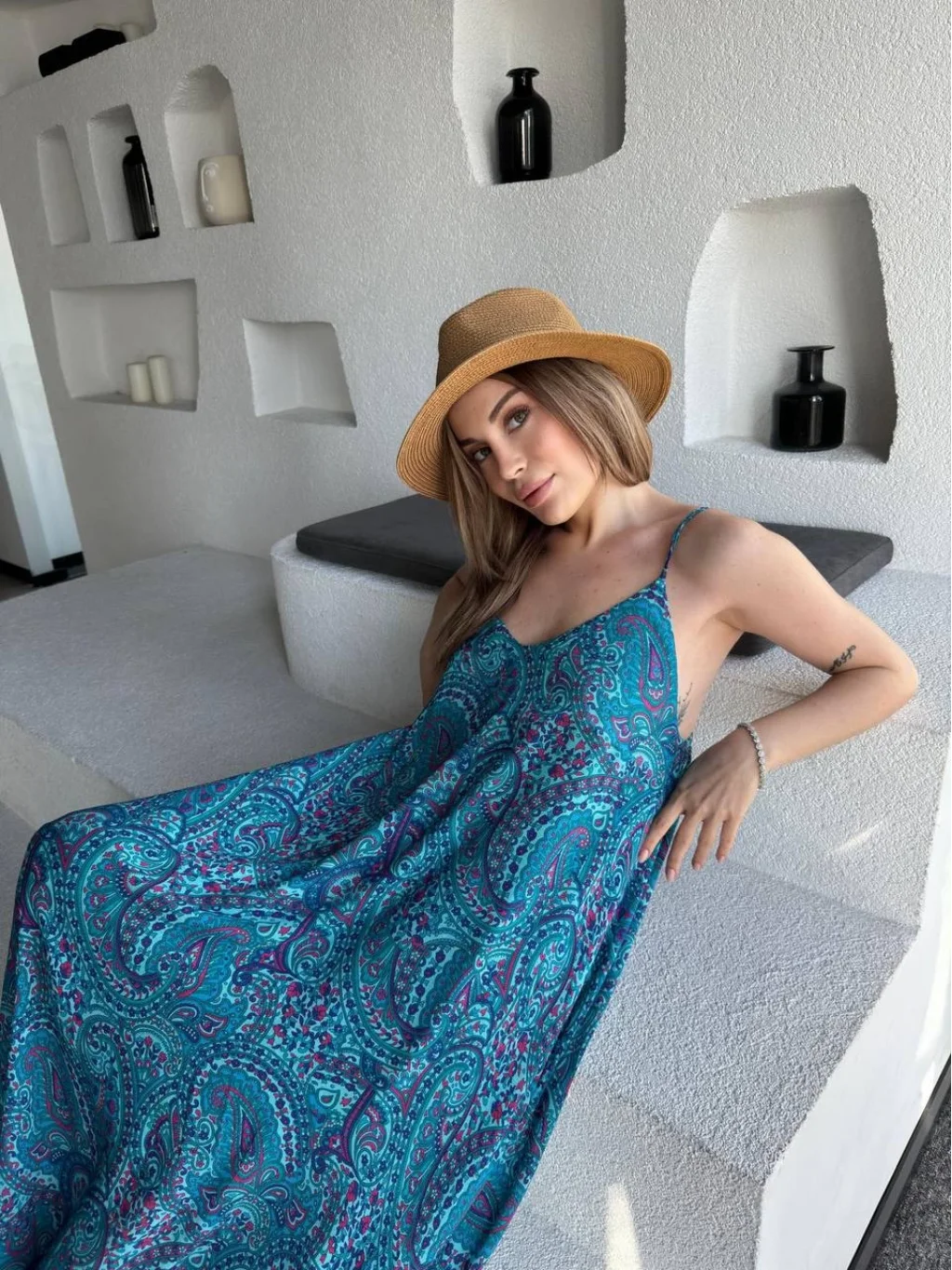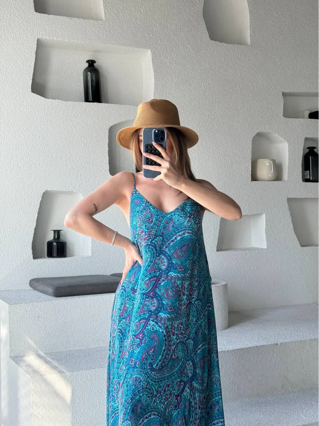Mavi Empirme Baskılı,İnce Ayarlanabilir Askılı, İç astarlı Midi Boy Elbise