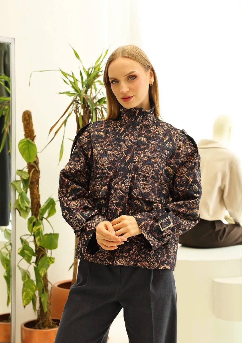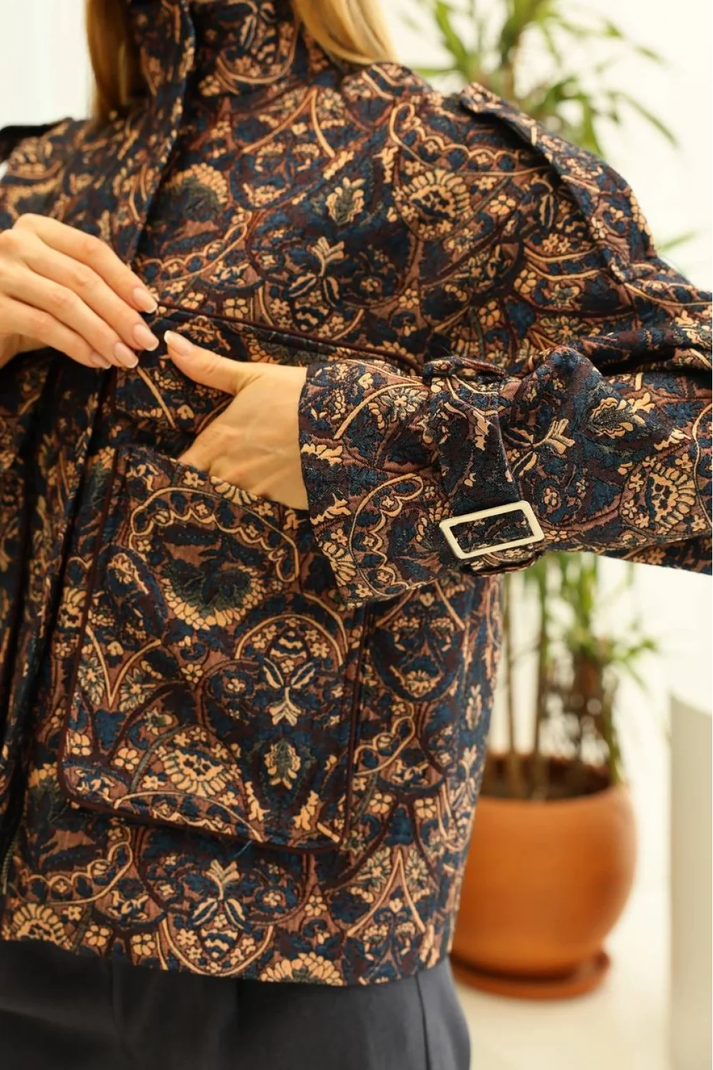 Jakar dokuma kumaş, kol kemer detaylı, ön iki torba cepli, iç astarlı, karışık etnik desenli özel dokulu kumaş, ön fermuar kapamalı etnik desen ceket.