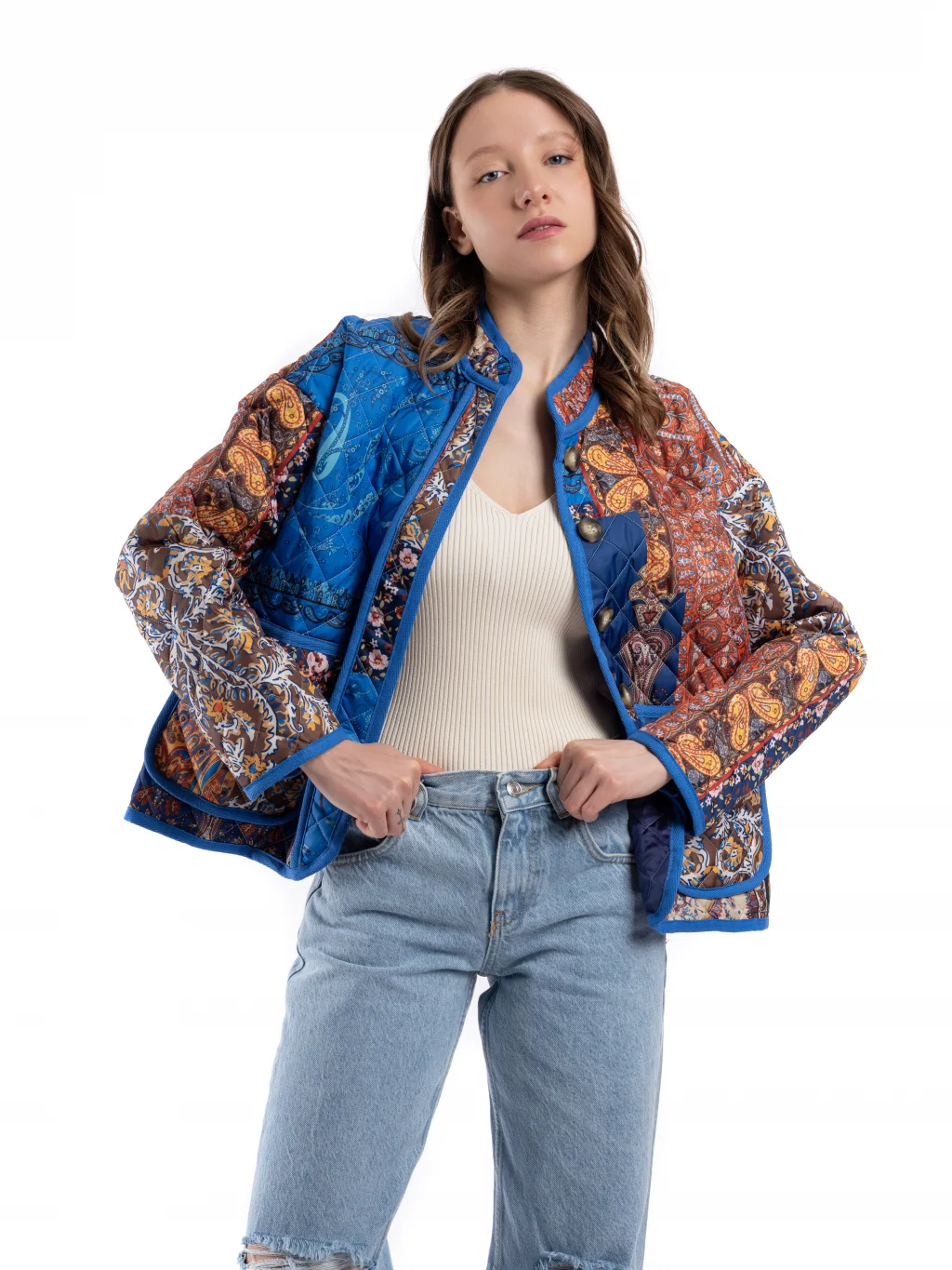 • PATCHWORK DESEN BİR ÜRÜNDÜR. ÜRÜN PARÇALARI AYNI YERLERDE BİRLEŞMEYEBİLİR. DESEN YERLERİ FARKLILIK GÖSTERİR. GÖRSELDEKİ İLE BİREBİR TARAFINIZA ULAŞMAYABİLİR UZUN KOLLU, DİK YAKA, KENARLARI BİYELİ, ÖNÜ GİZLİ DÜĞMELİ, KAPAK CEPLİ, ETNİK DESENLİ, KAPİTONE CEKET