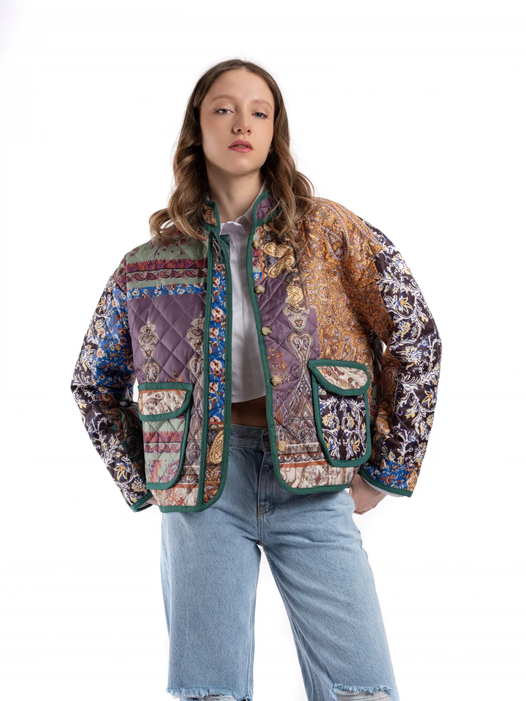 • PATCHWORK DESEN BİR ÜRÜNDÜR. ÜRÜN PARÇALARI AYNI YERLERDE BİRLEŞMEYEBİLİR. DESEN YERLERİ FARKLILIK GÖSTERİR. GÖRSELDEKİ İLE BİREBİR TARAFINIZA ULAŞMAYABİLİR UZUN KOLLU, DİK YAKA, KENARLARI BİYELİ, ÖNÜ GİZLİ DÜĞMELİ, KAPAK CEPLİ, ETNİK DESENLİ, KAPİTONE CEKET