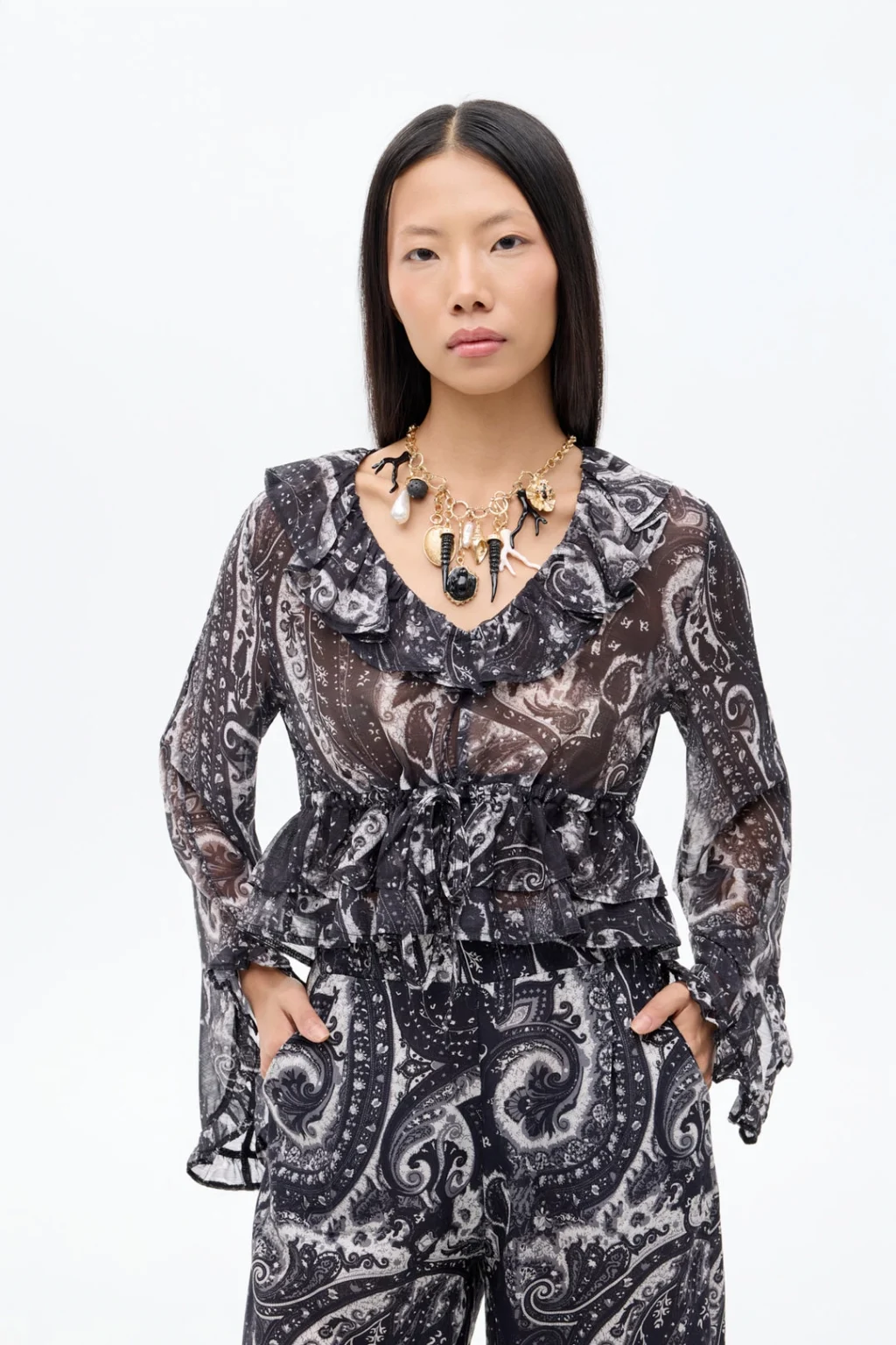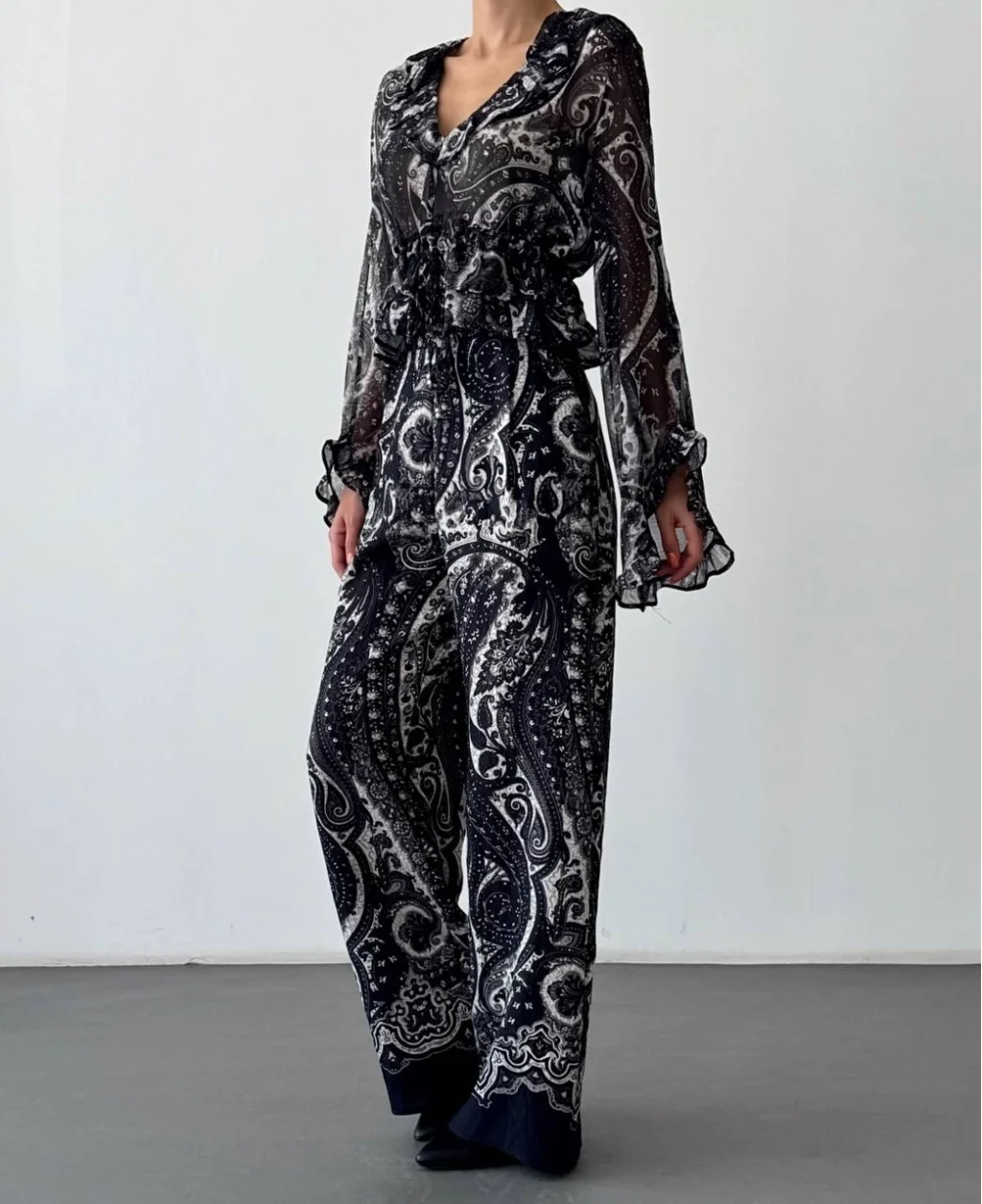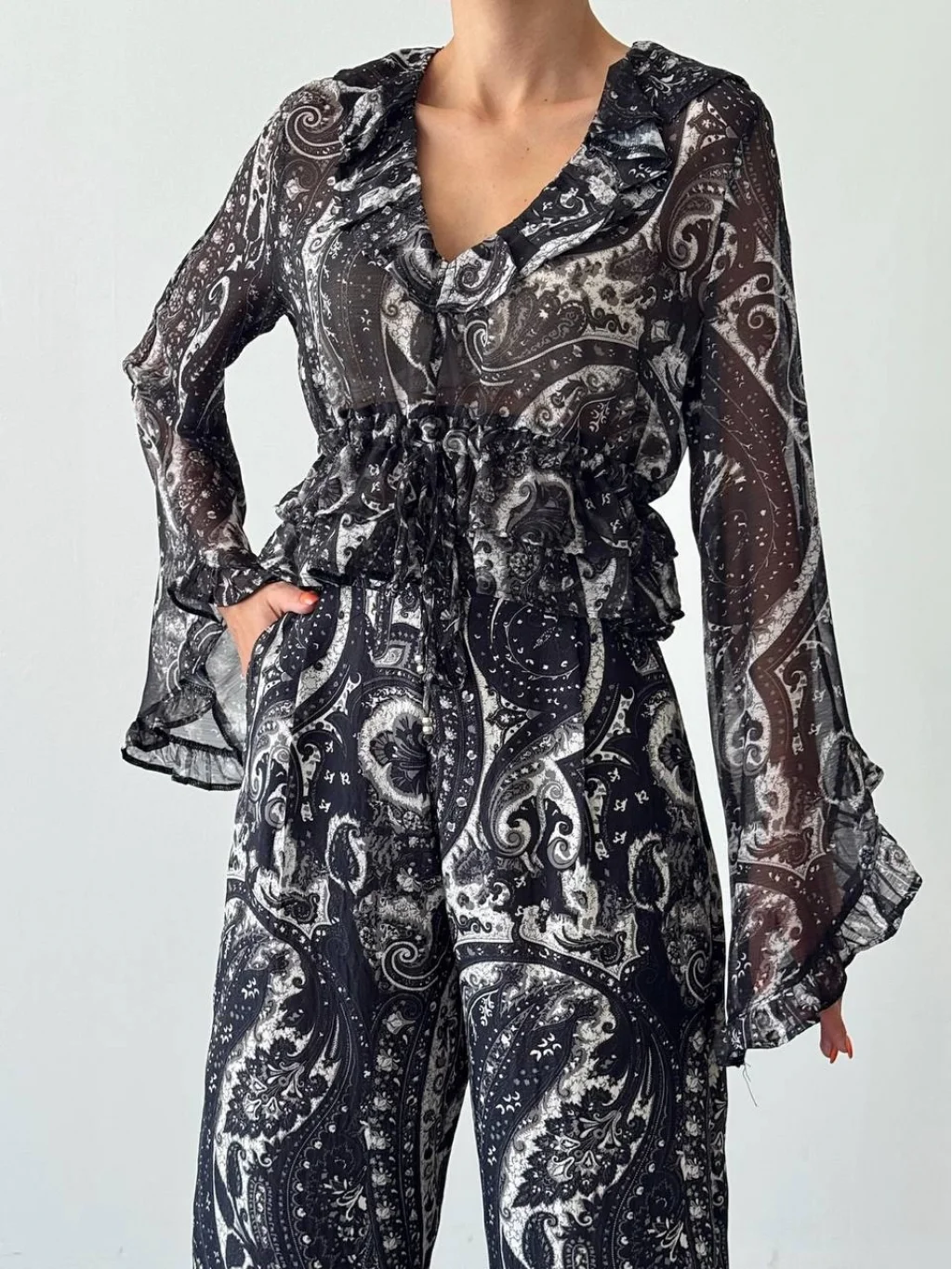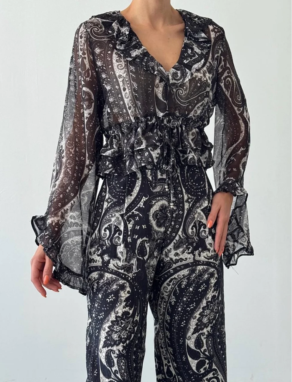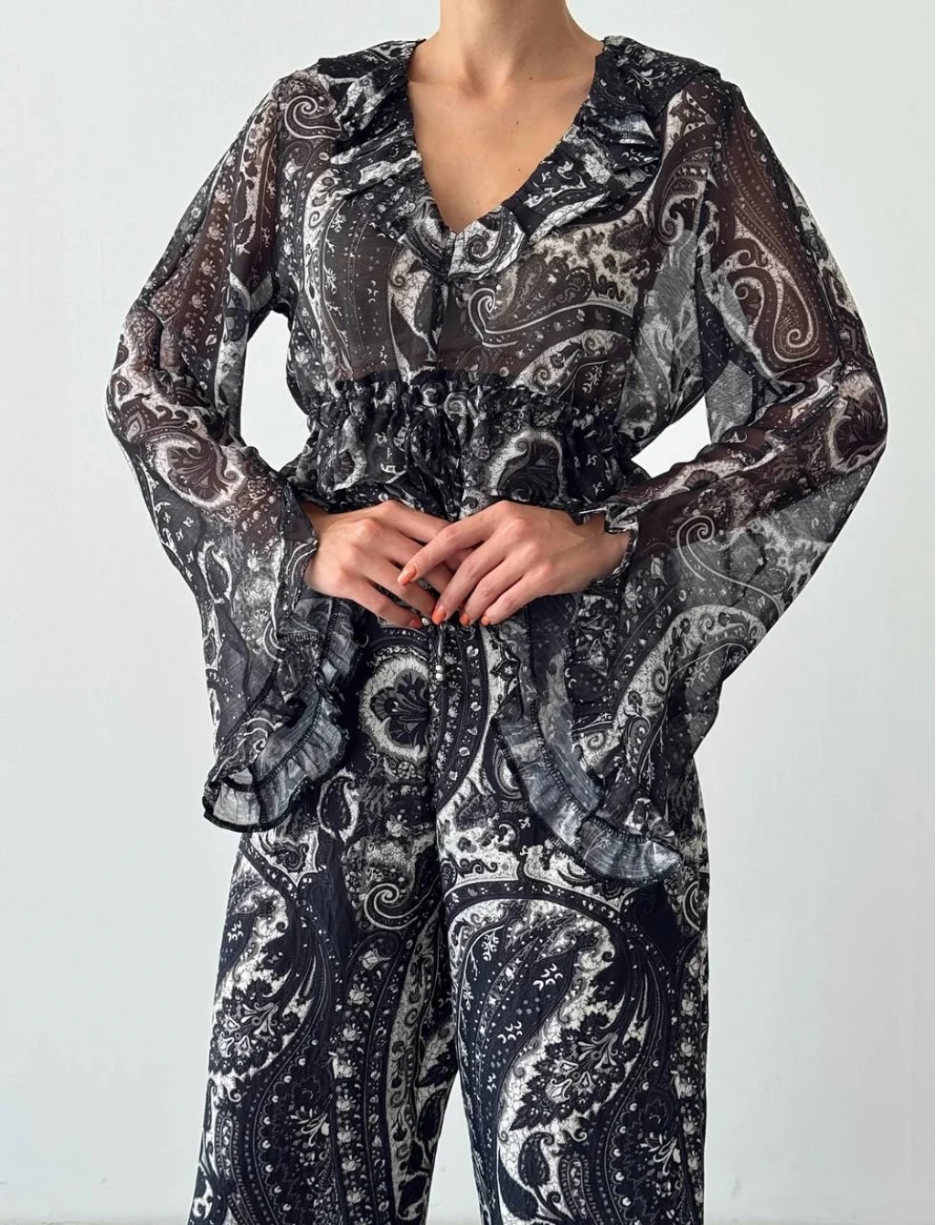 Tül etnik desenli kumaş, içi astarsız transparan görünümde, v yaka, beli bağcık detaylı, uzun kollu, kolu asimetrik kesimli, fırfırlı bluz.