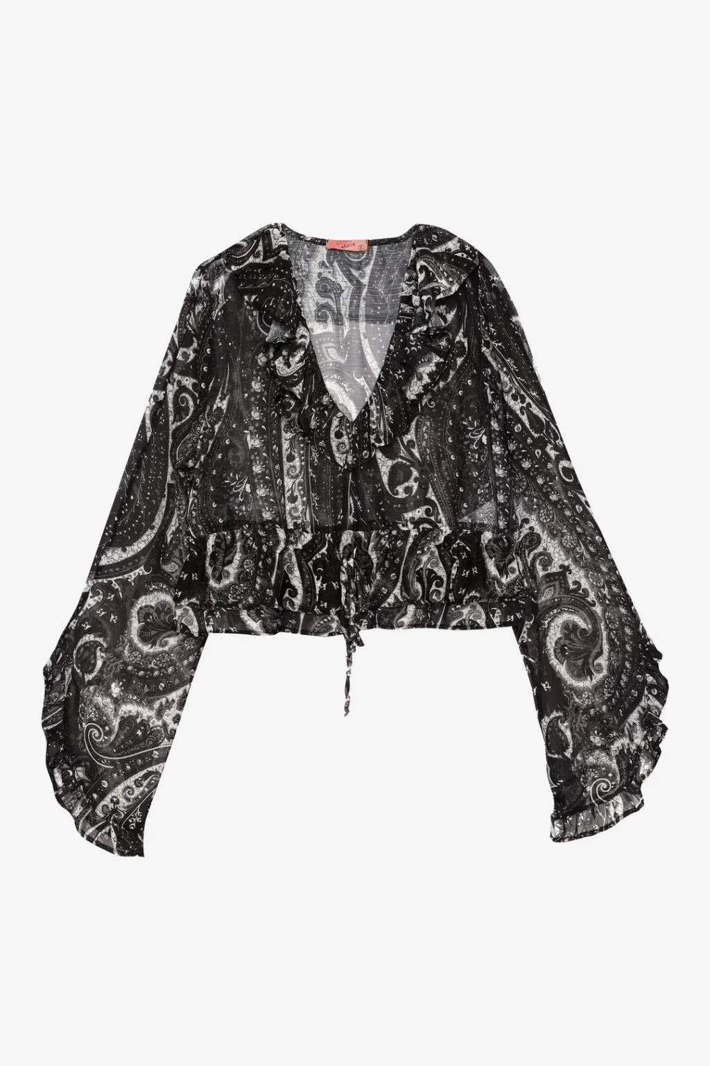 MYRA'nın etnik desenli, fırfırlı detaylara sahip siyah V yaka tül bluzu şıklığı ve zarafeti bir arada sunuyor.