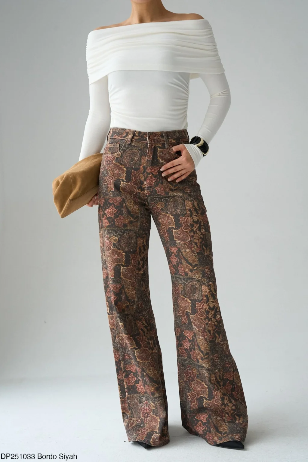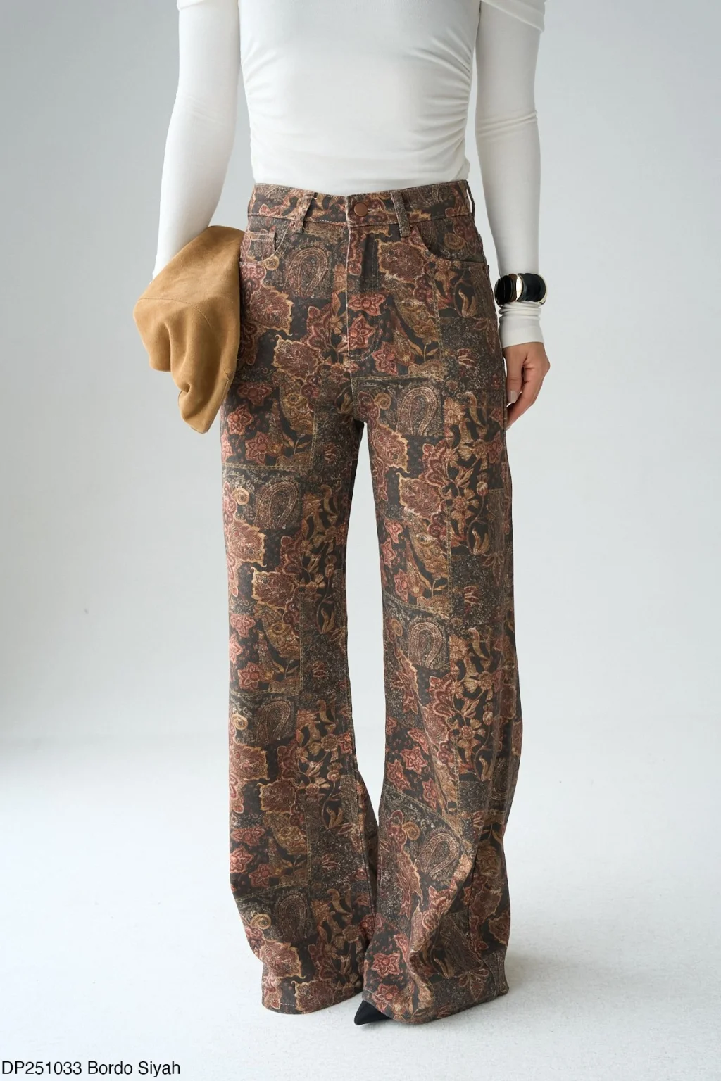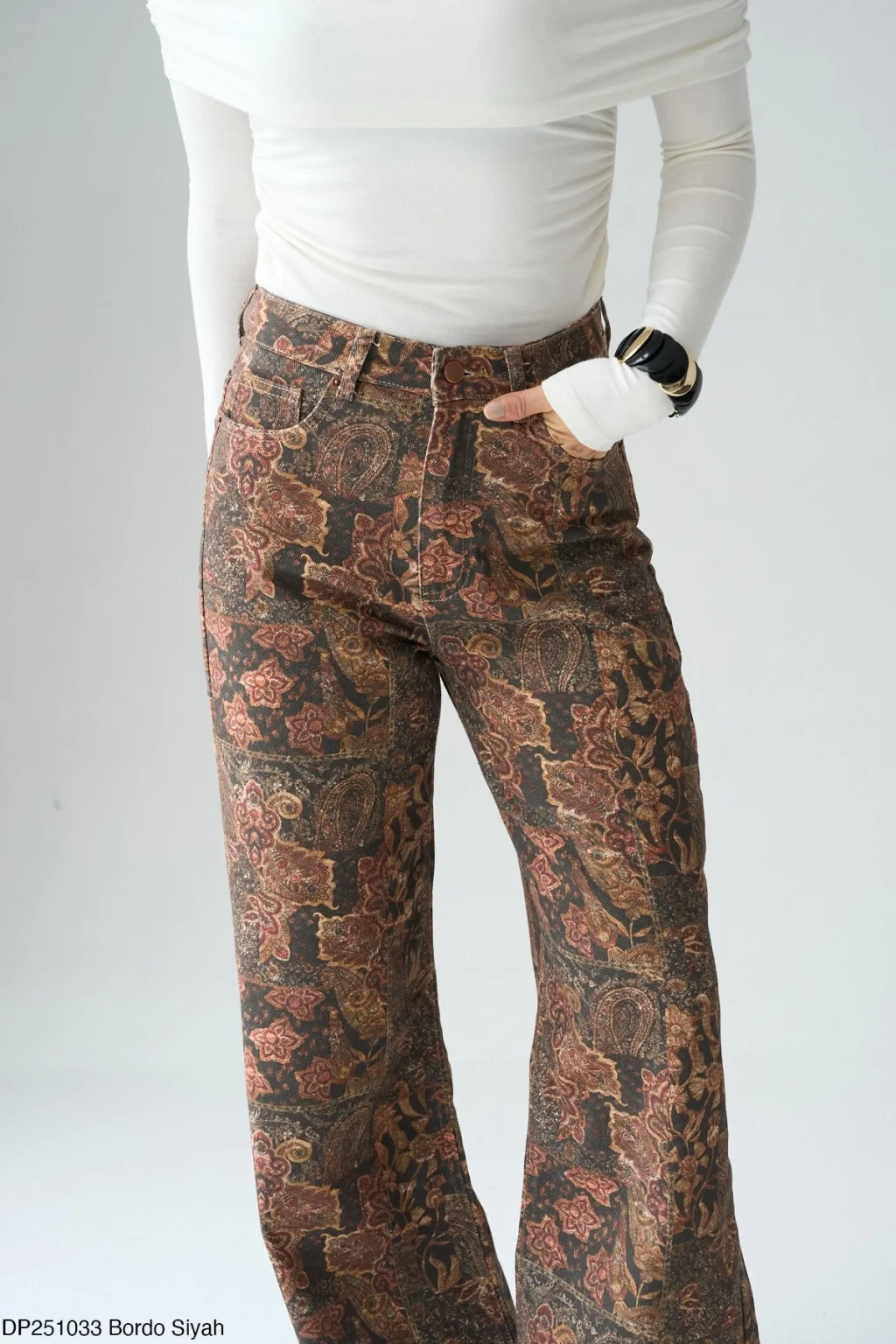 Yüksek Bel, Standart cepli , geniş paçalı, bordo siyah desenli denim pantolon.