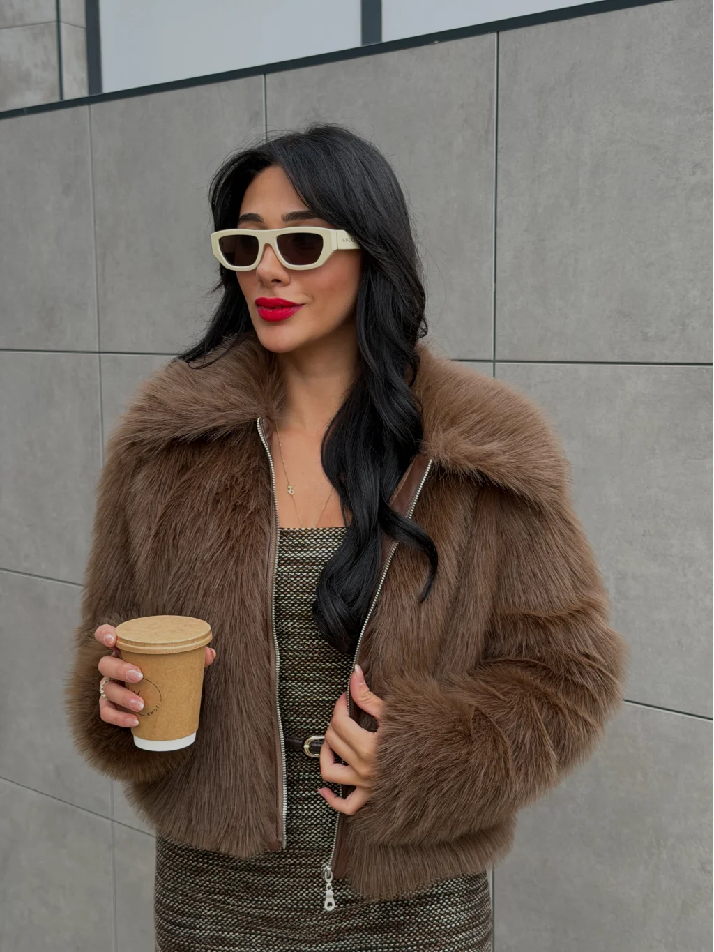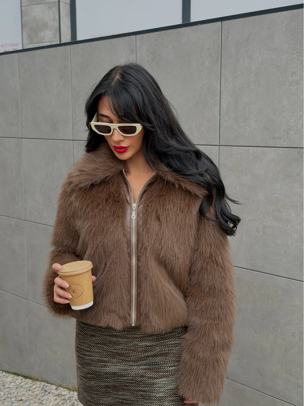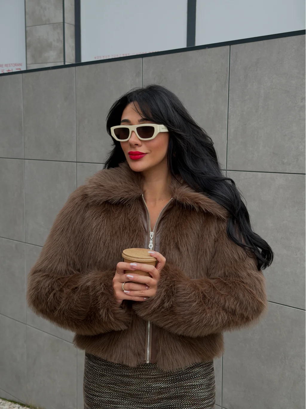 MYRA marka kahverengi kürk, fermuar kapama detayıyla şıklığı ve kullanım kolaylığını bir arada sunar.