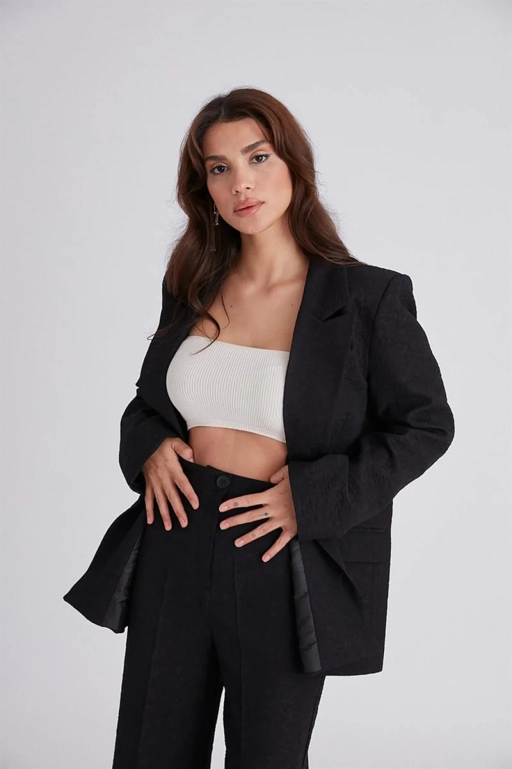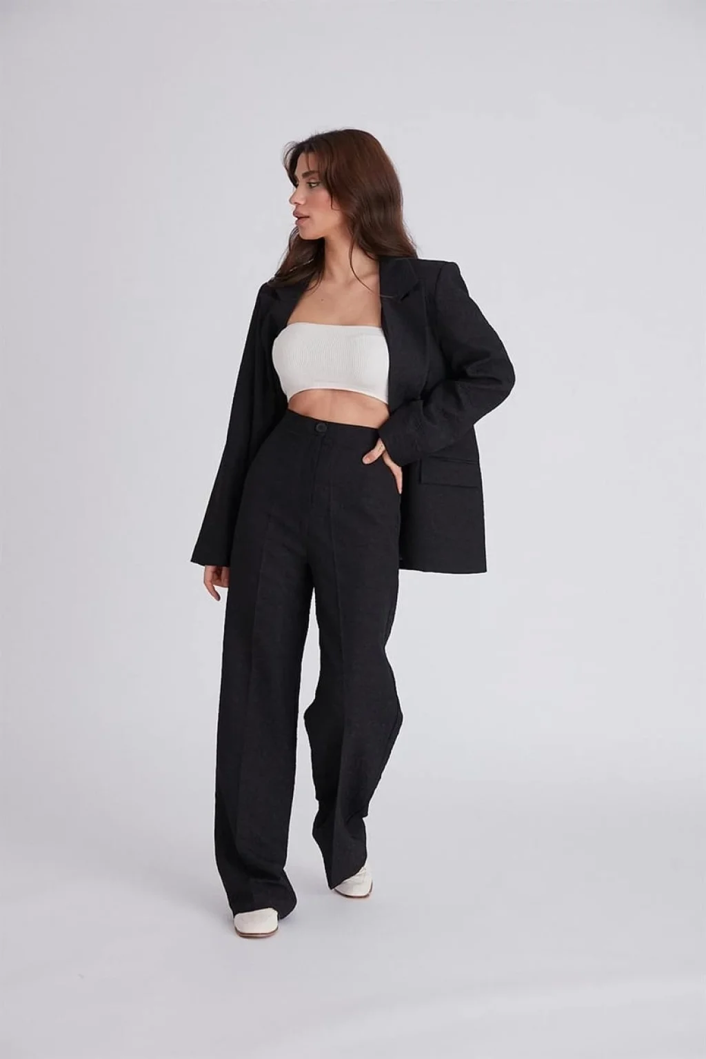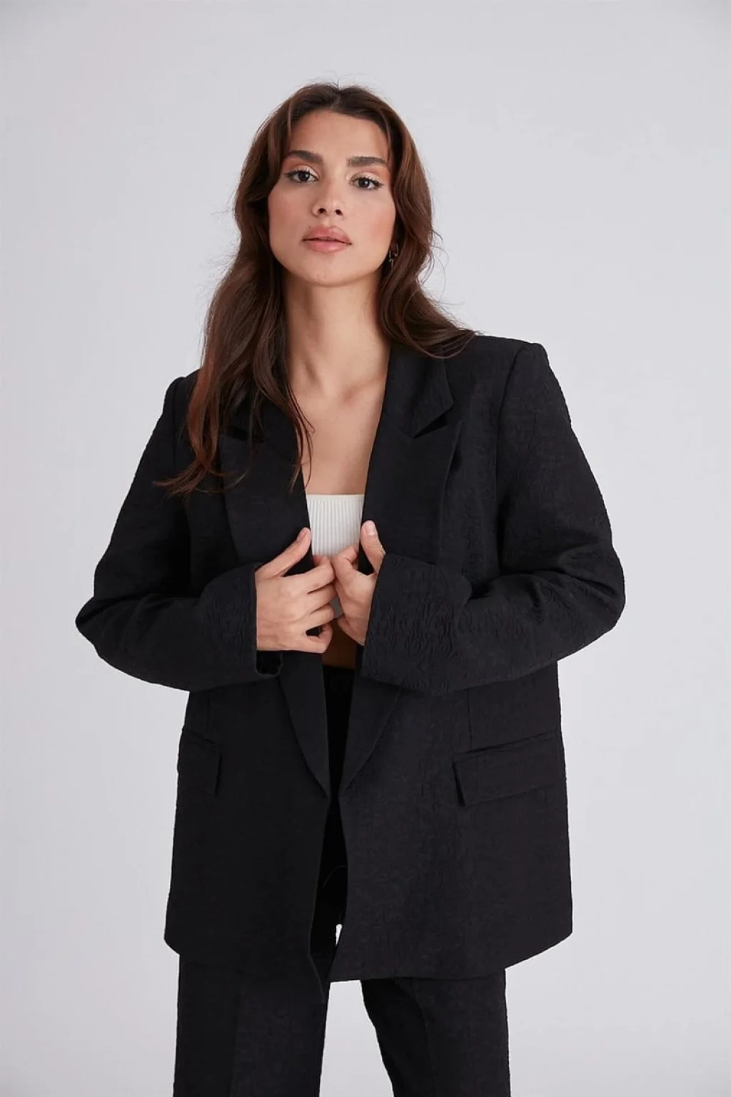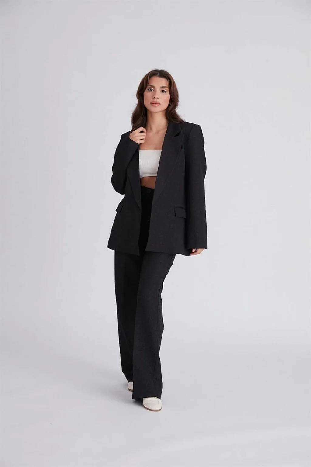 GABARDİN DOKULU SİYAH CEKET PALAZZO PANTOLON TAKIM