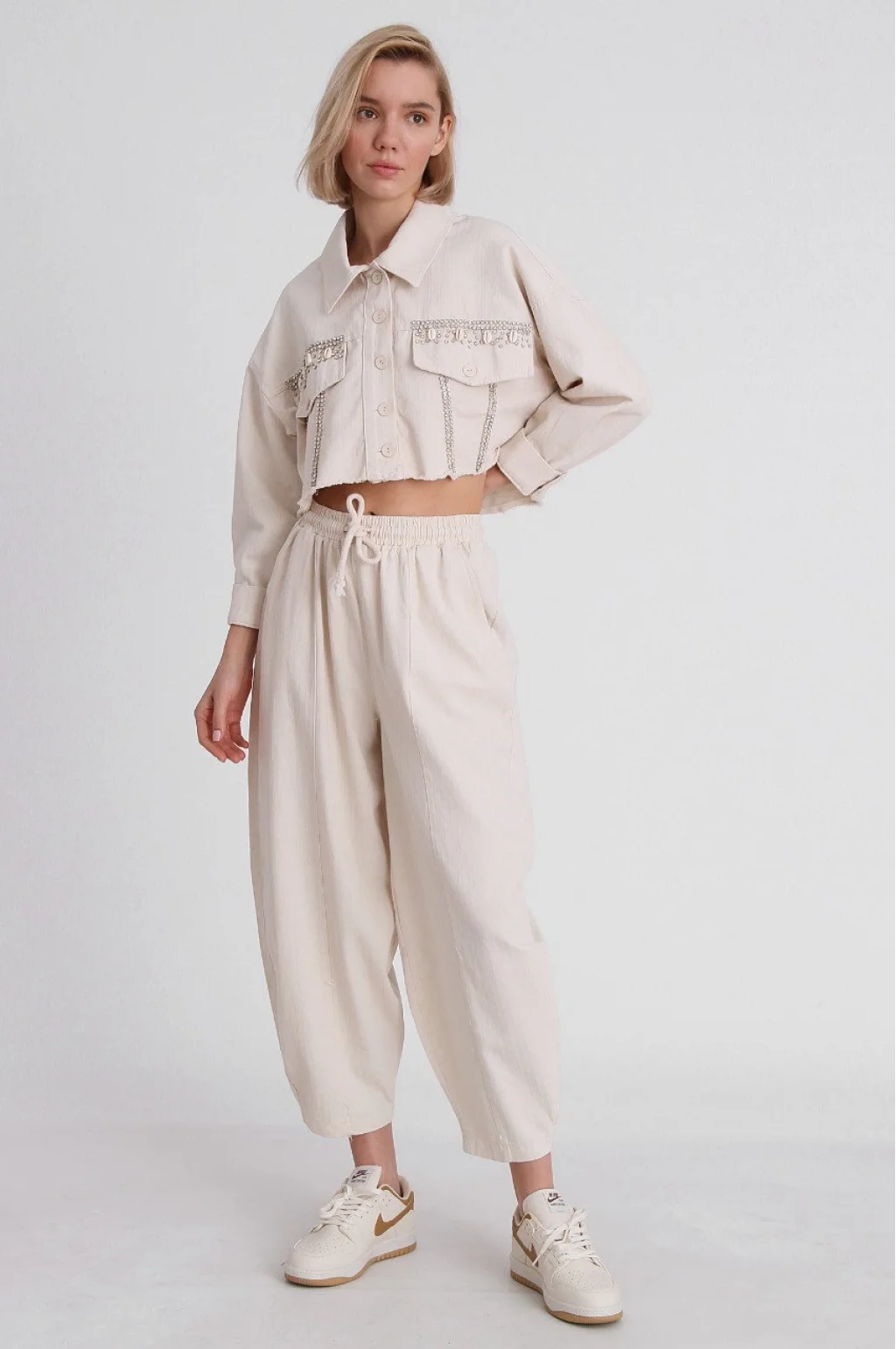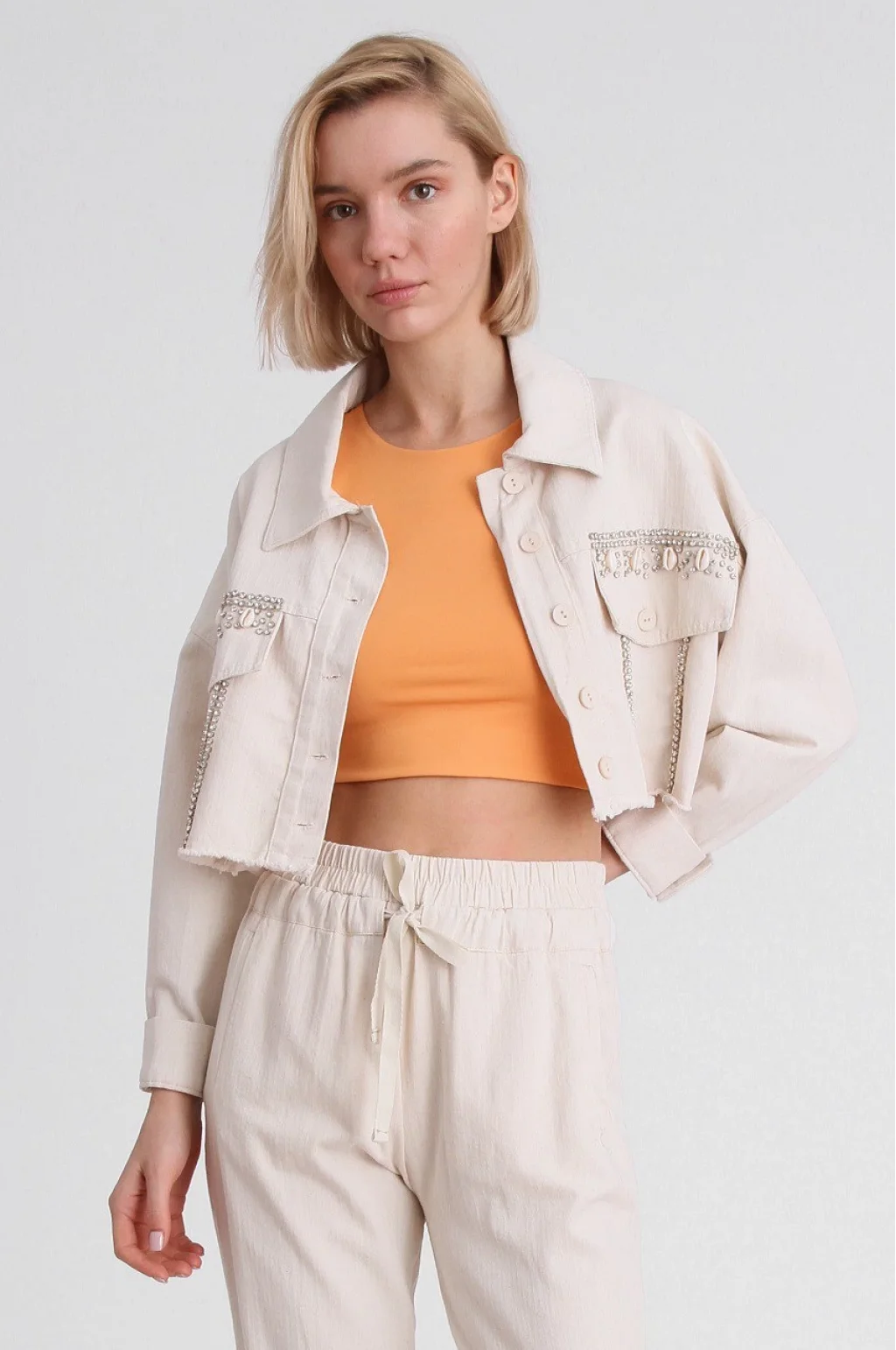 GABARDİN TAŞLI CROP CEKET EKRU