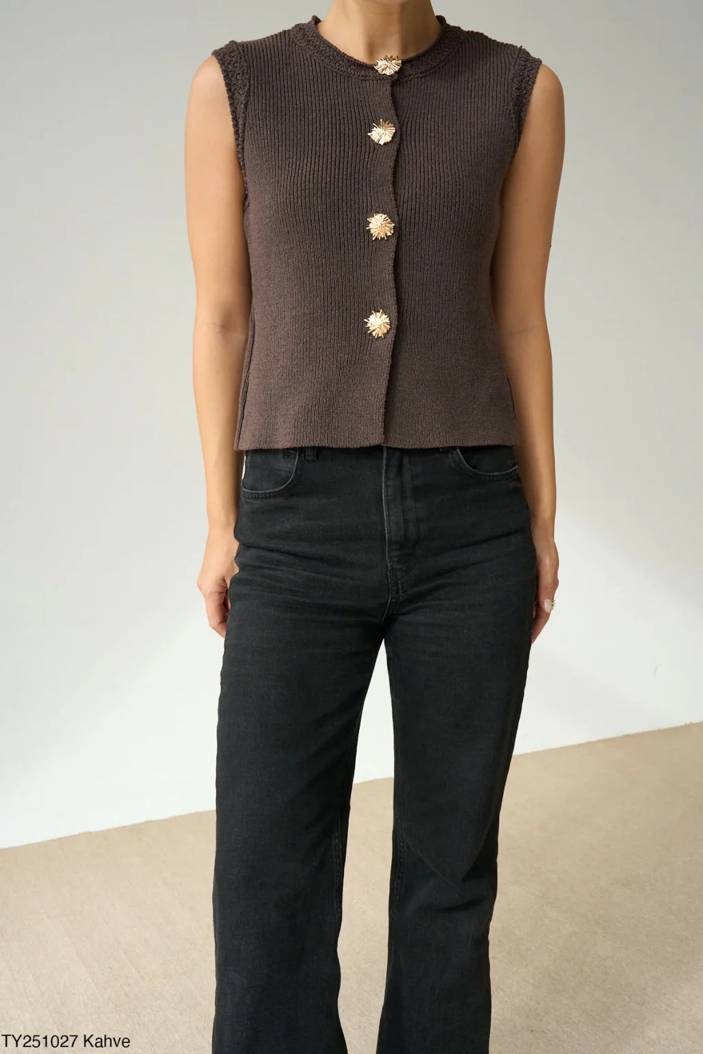 Ön Gold Düğme kapamalı standart beden esnek kumaş kahverengi yelek