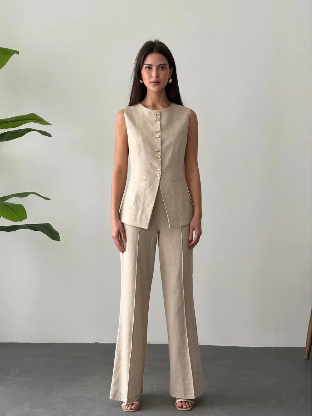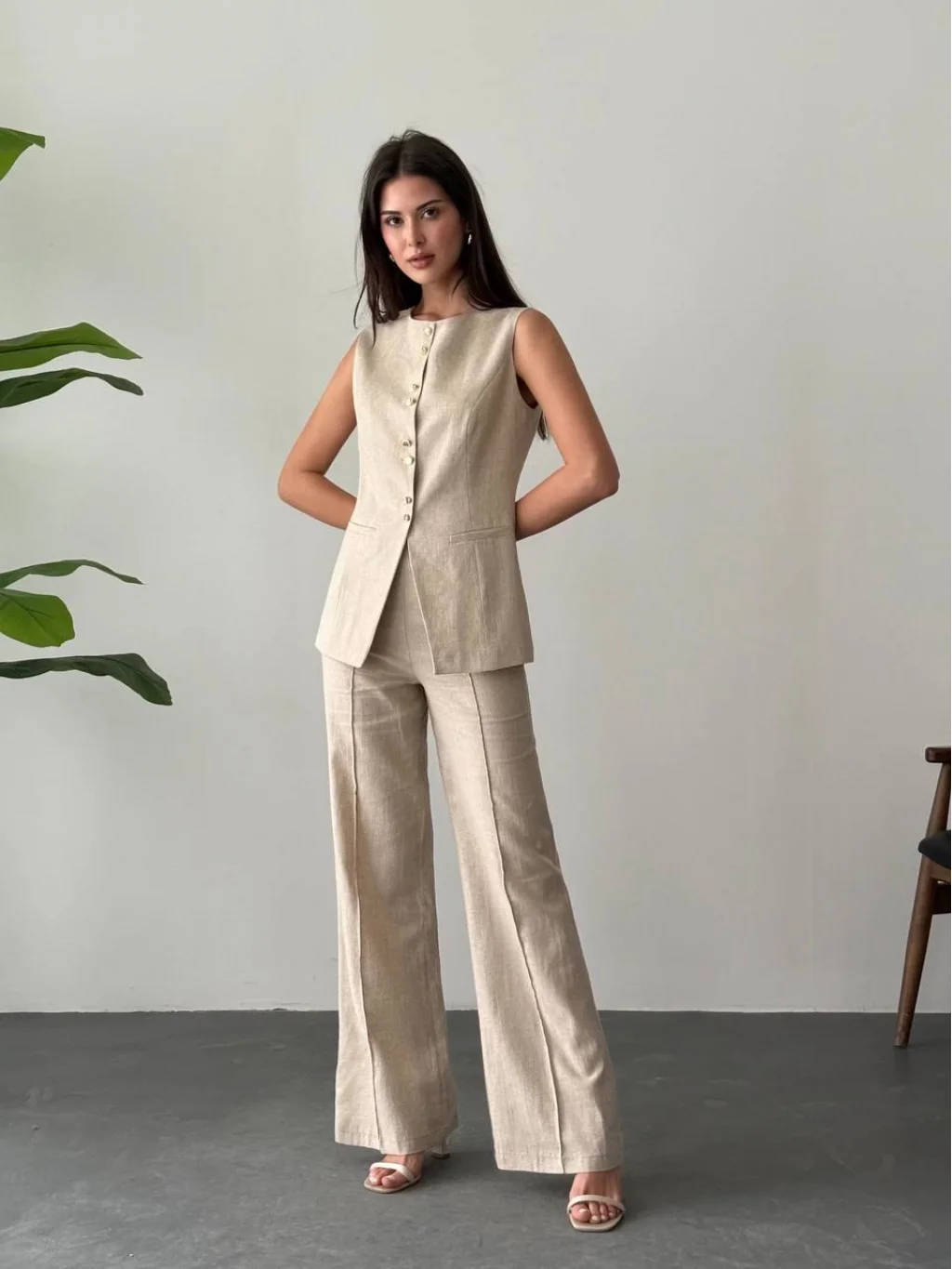 %100 keten kumaştan üretilen bu şık takım, sıcak havalarda ferah bir kullanım sunar. Kolsuz, düğmeli ceket tasarımı ve geniş paça pantolonu ile zarif bir siluet oluşturur. Ofis şıklığından davet kombinlerine kadar geniş kullanım alanına sahiptir. Doğal kumaş yapısıyla cildinizin nefes almasına yardımcı olur.