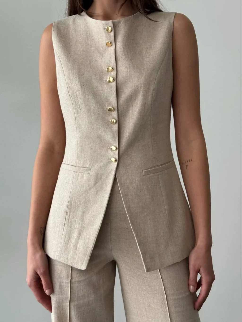 Gold Düğme Keten Yelek Pantolon Takım