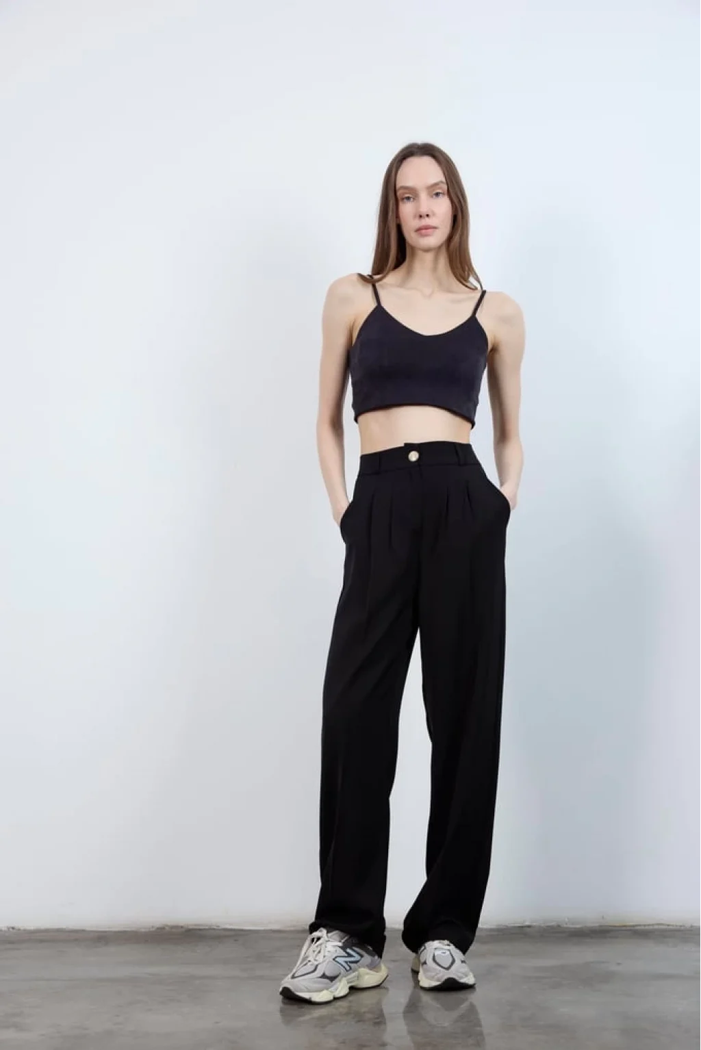 YÜKSEK BEL, ÖNÜ FERMUARLI VE GOLD DÜĞMELİ, ARKASI LASTİKLİ, YANLARI CEPLİ, PLAZZO PANTOLON