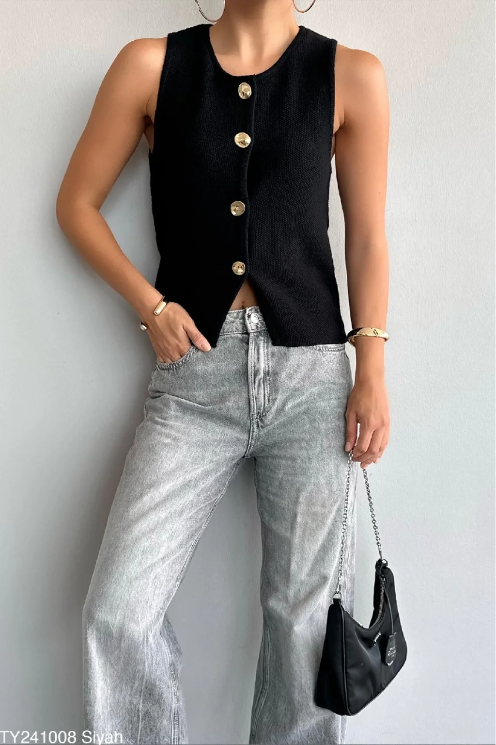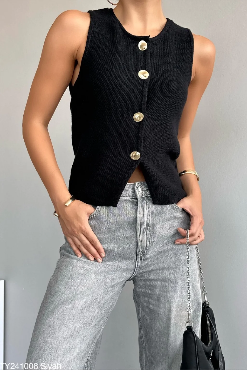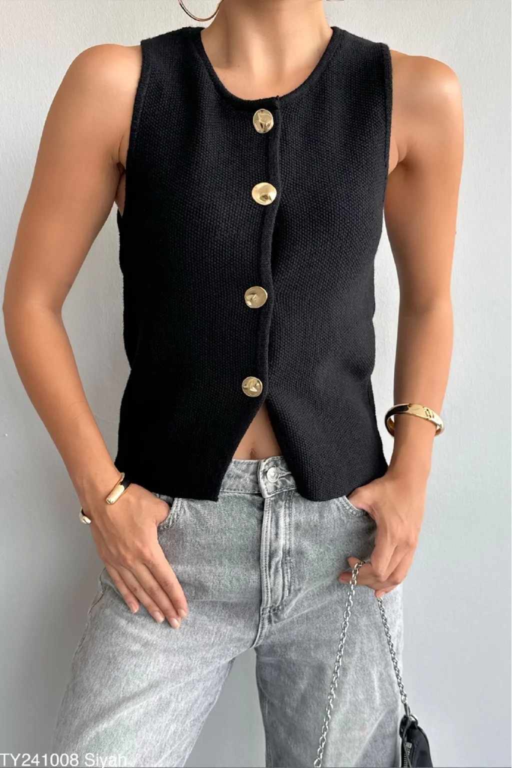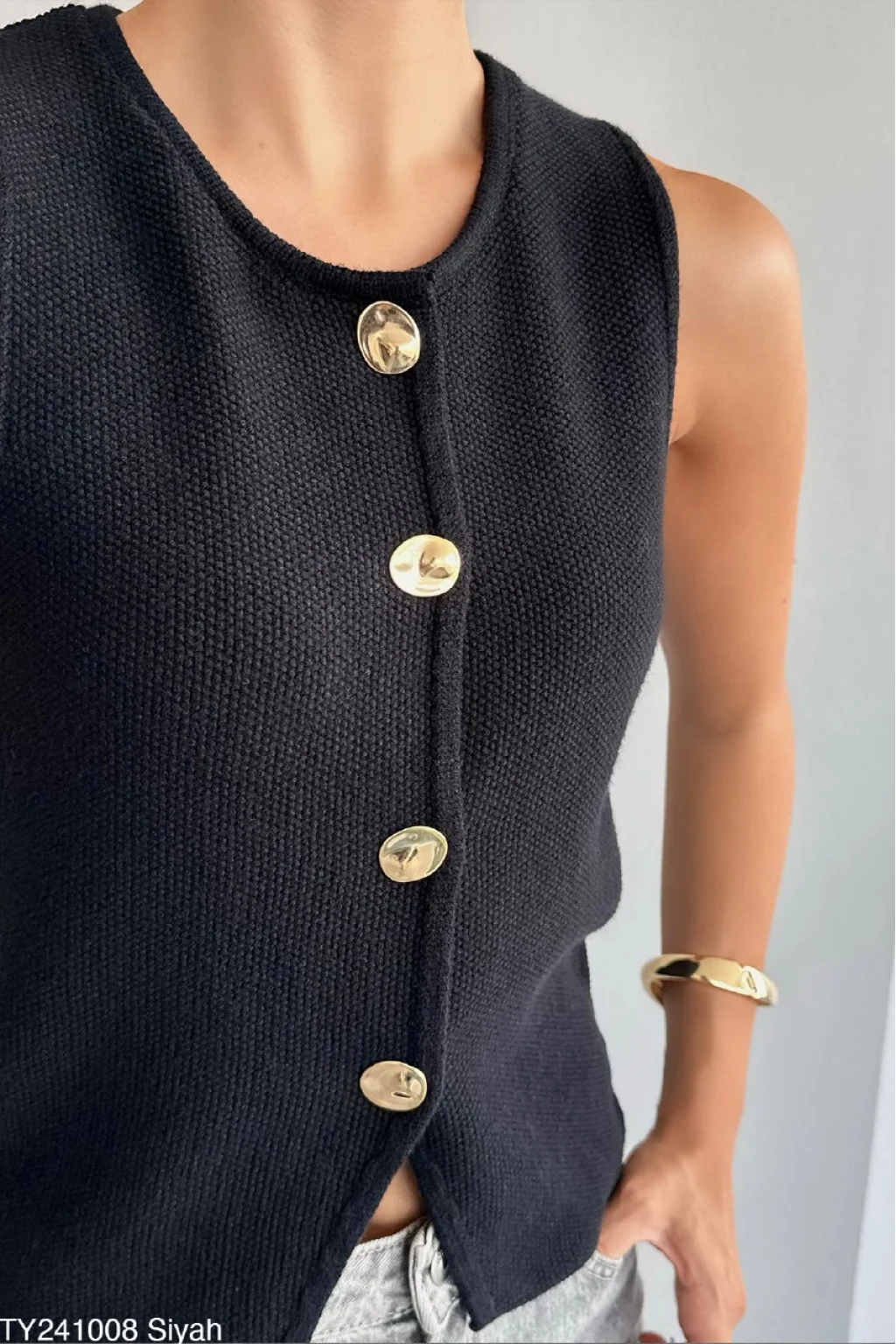 Gold Düğme Siyah Triko Yelek