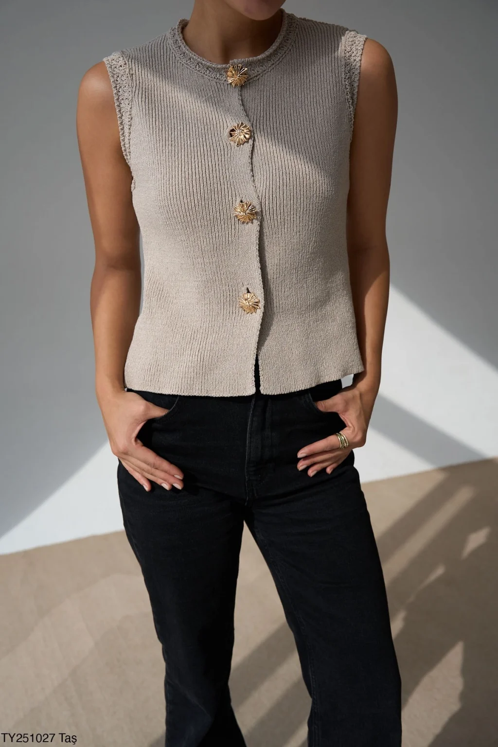 • MYRA Gold Düğme Vizon Triko Yelek, şıklığı ve rahatlığı bir arada sunar.