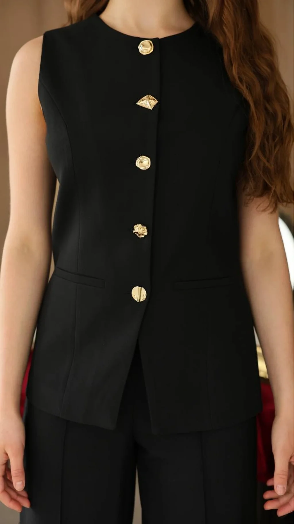 Gold Düğme Yelek Pantolon Takım - Siyah