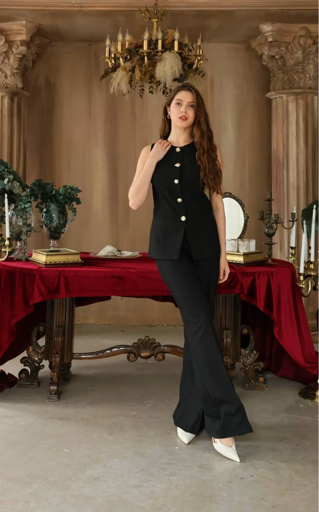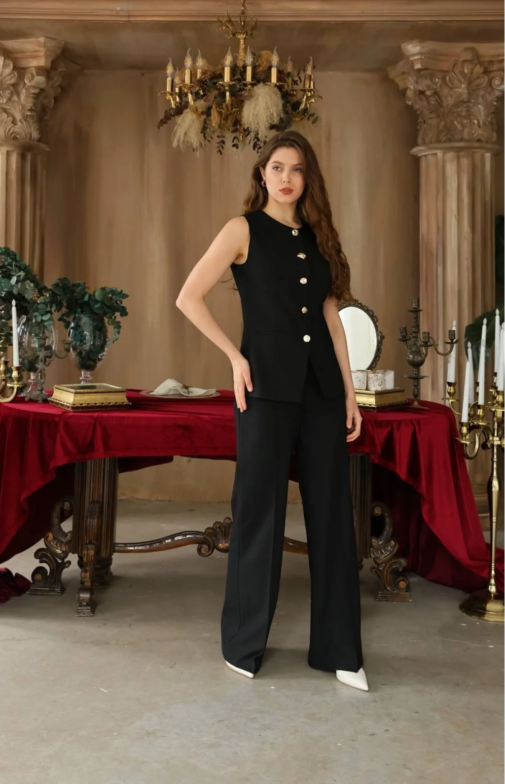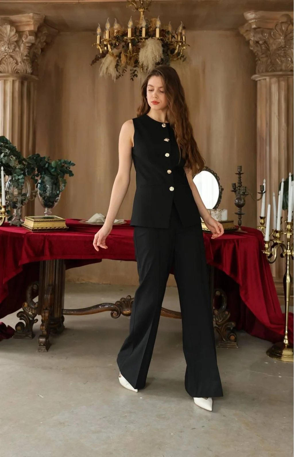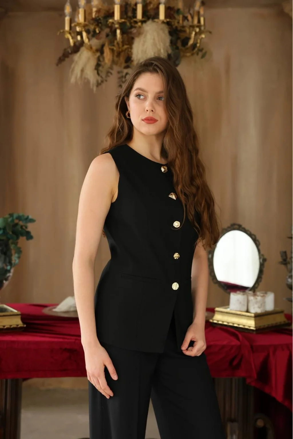 • MYRA Gold Düğme Yelek Pantolon Takım - Siyah, şıklığı ve zarafeti bir arada sunar.