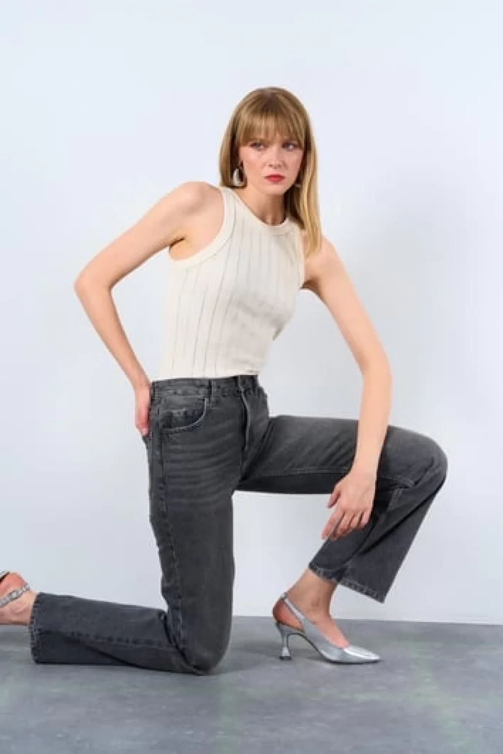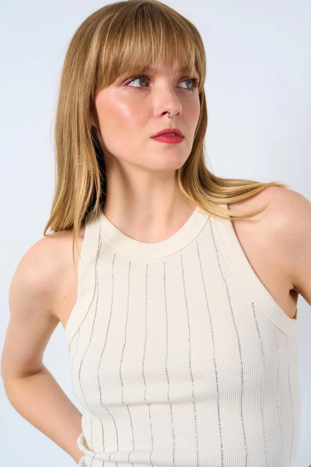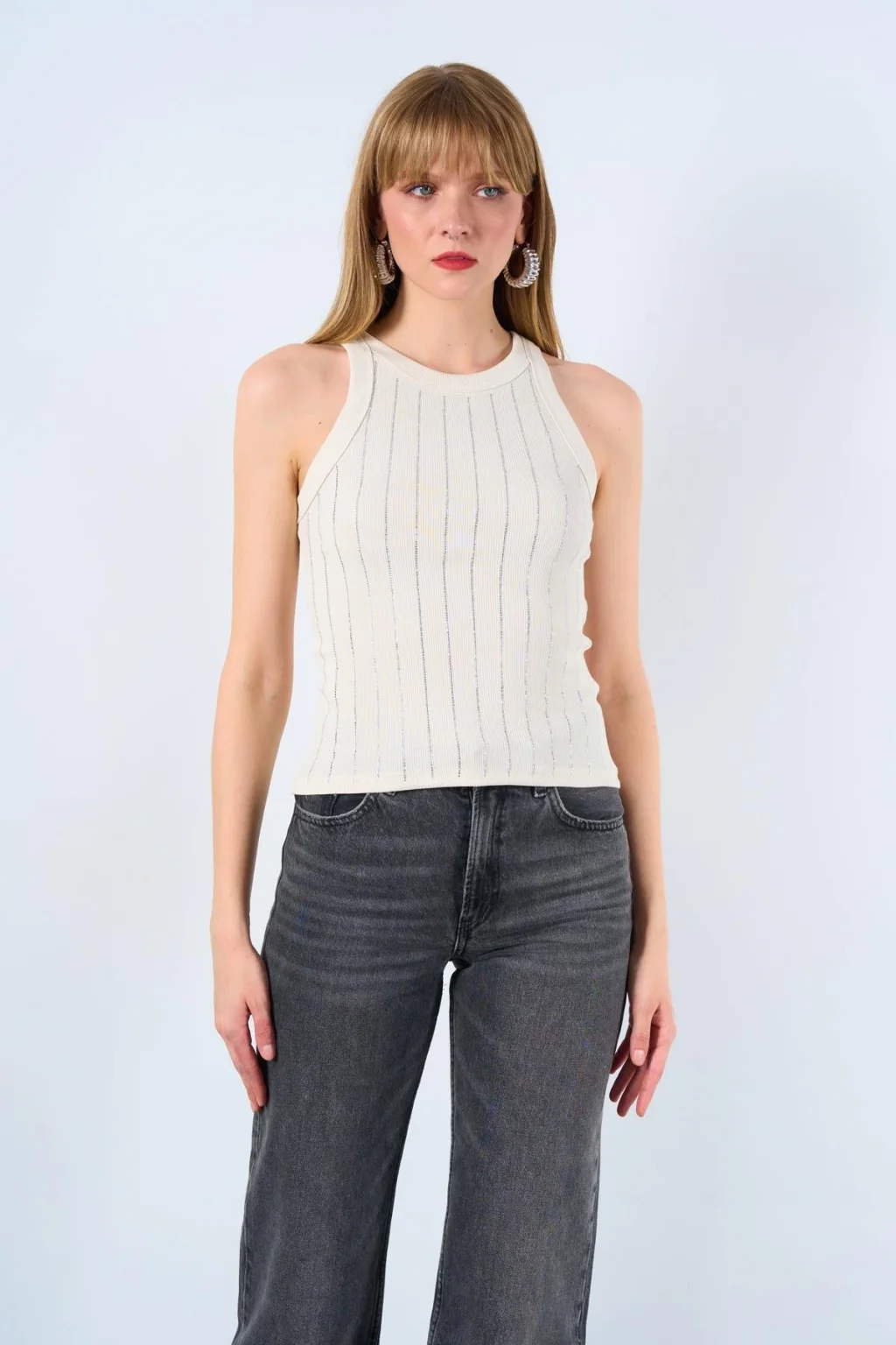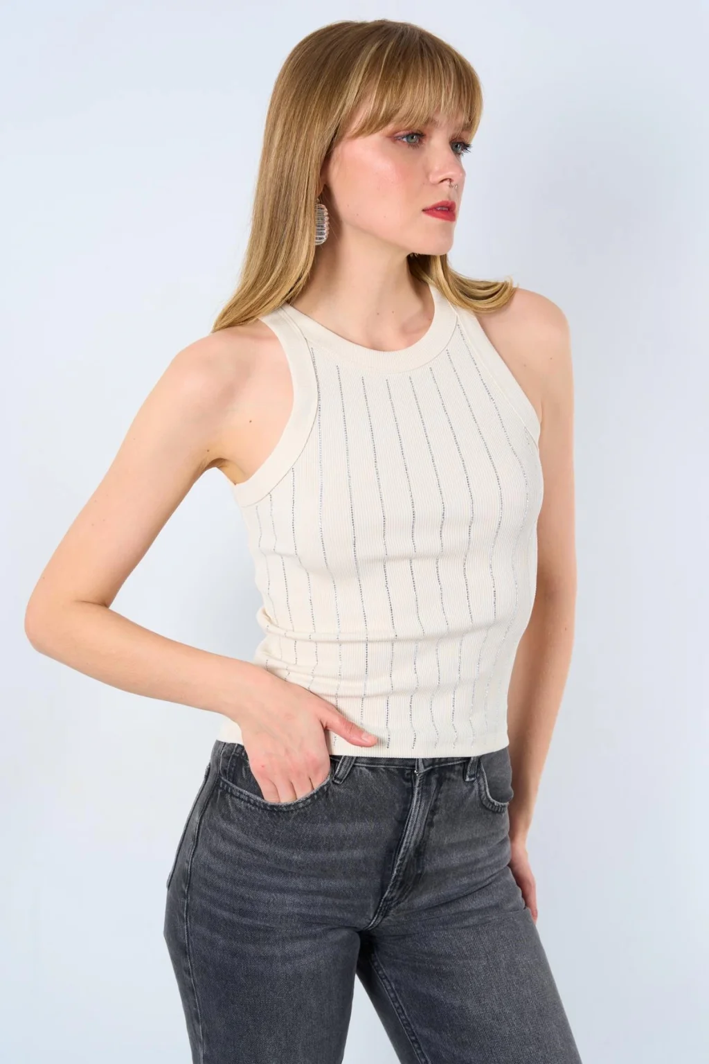 Halter Yaka Taş Baskılı Atlet - Ekru