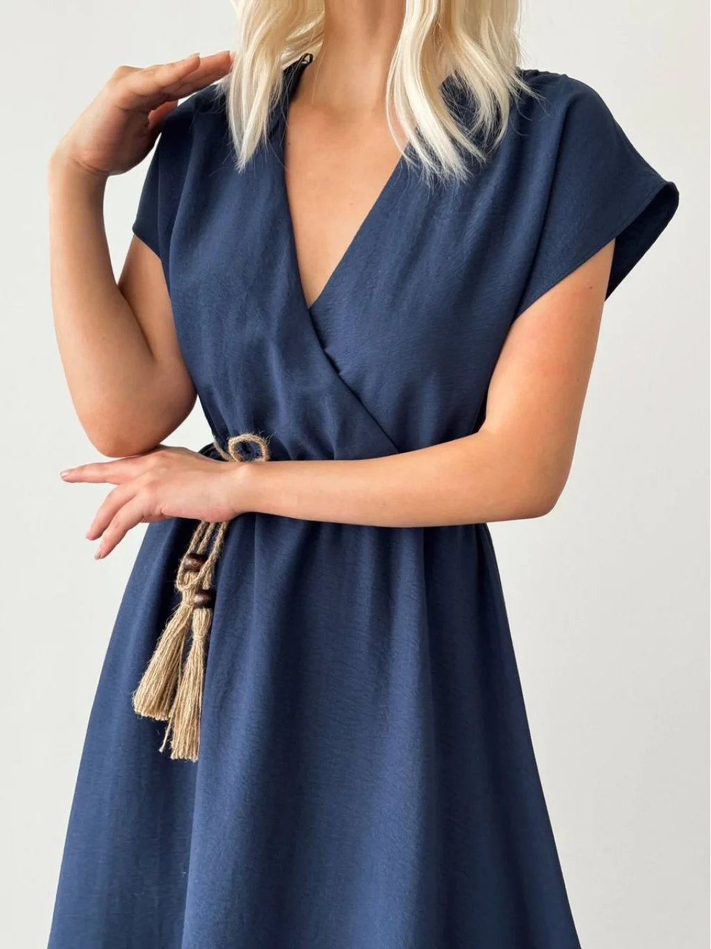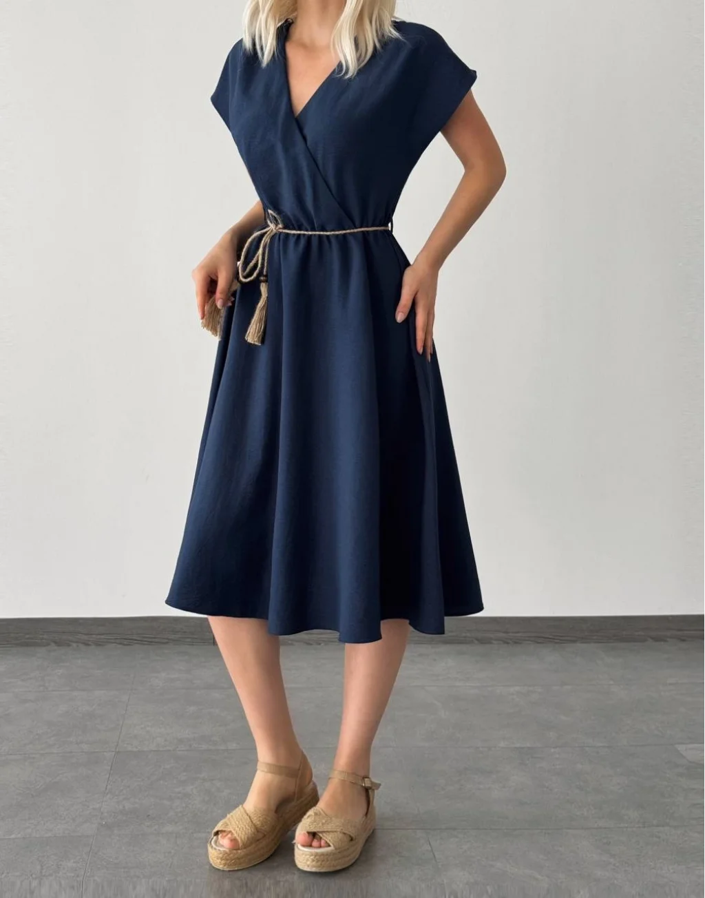 HASIR BAĞLAMALI MİDİ BOY ELBİSE LACİVERT