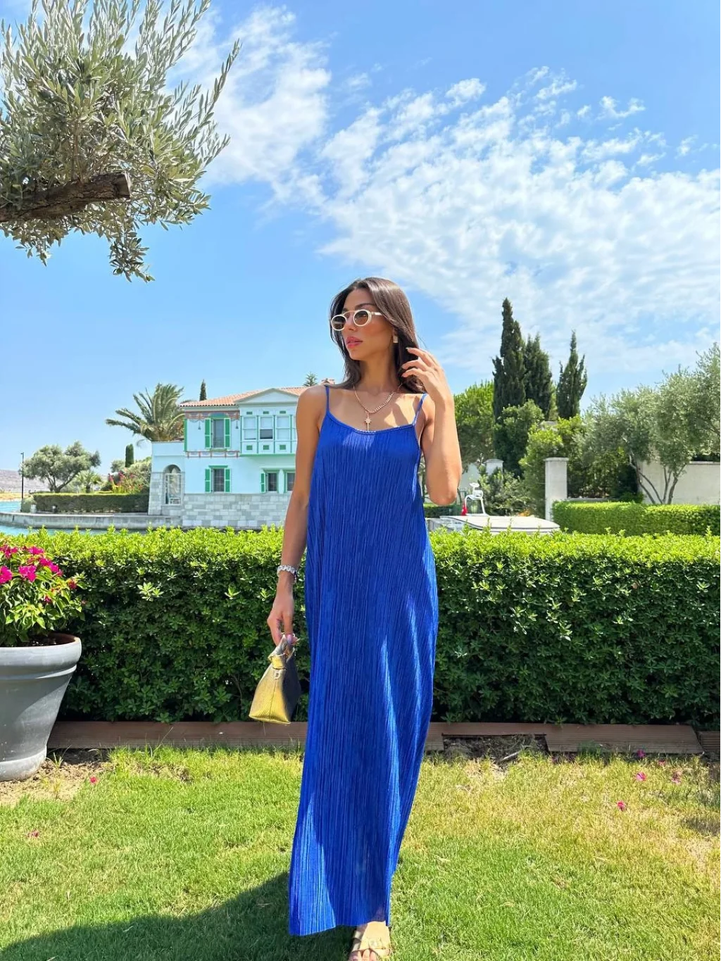 İNCE ASKILI PİLİSE MAVİ UZUN ELBİSE