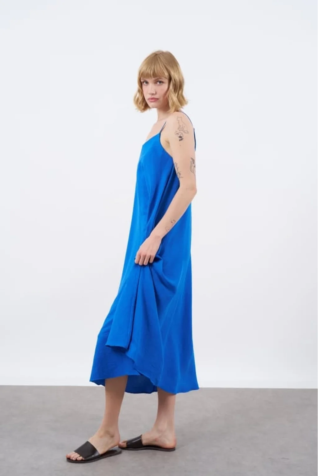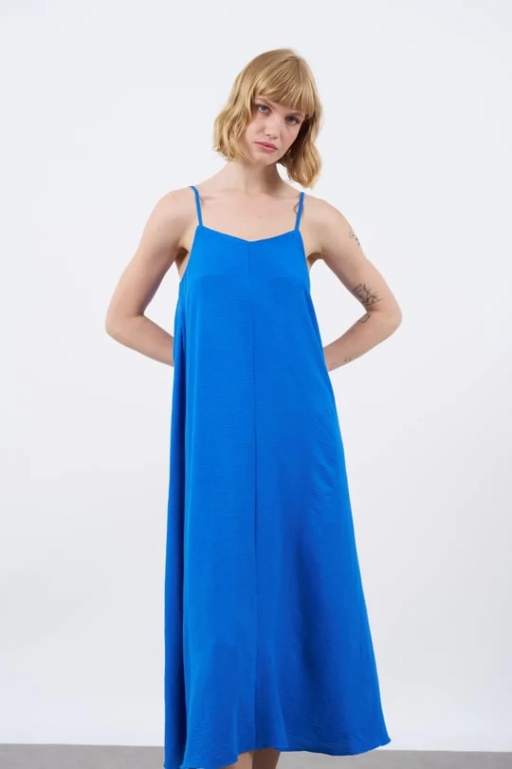 İNCE ASKILI UZUN KETEN ELBİSE SAKS MAVİ