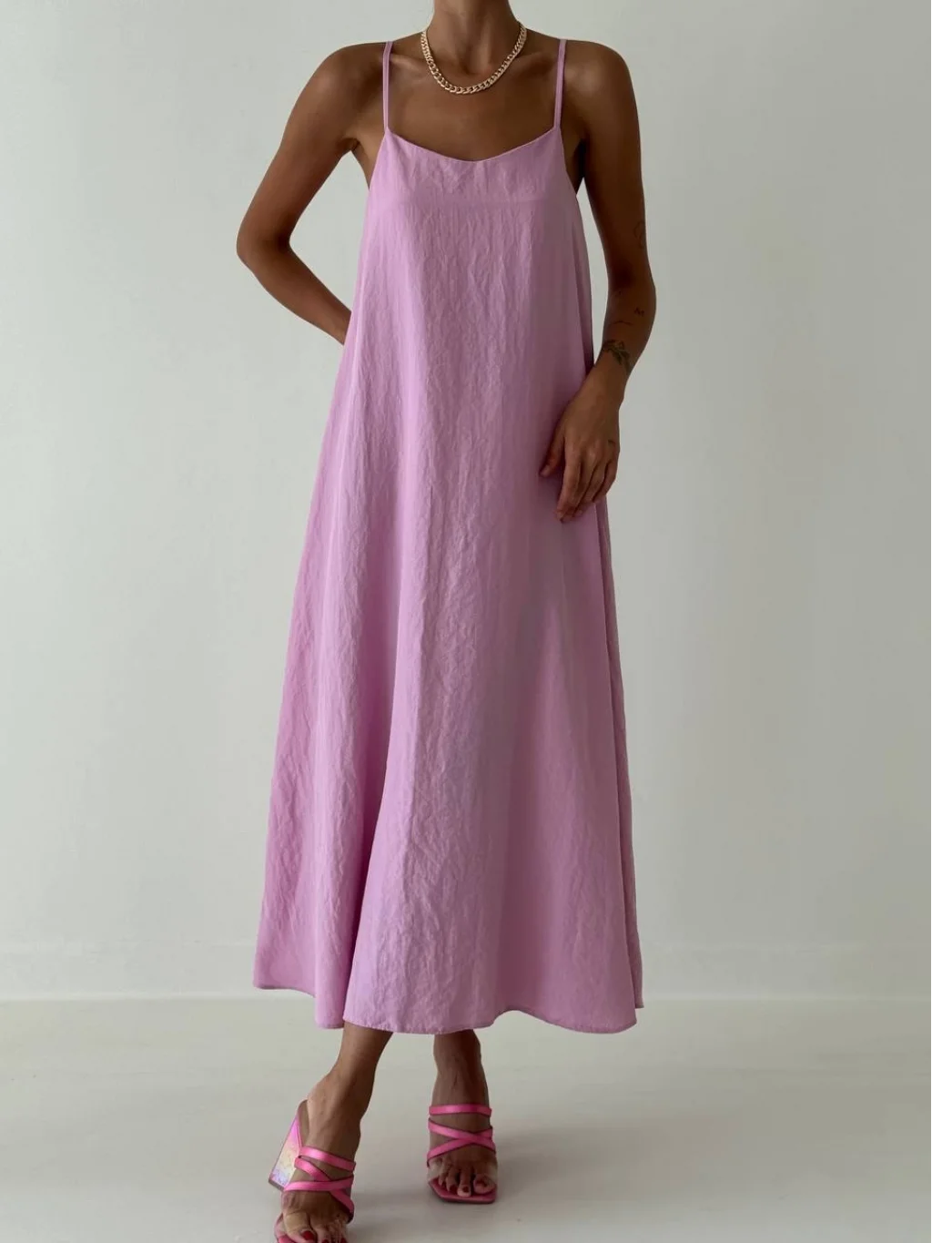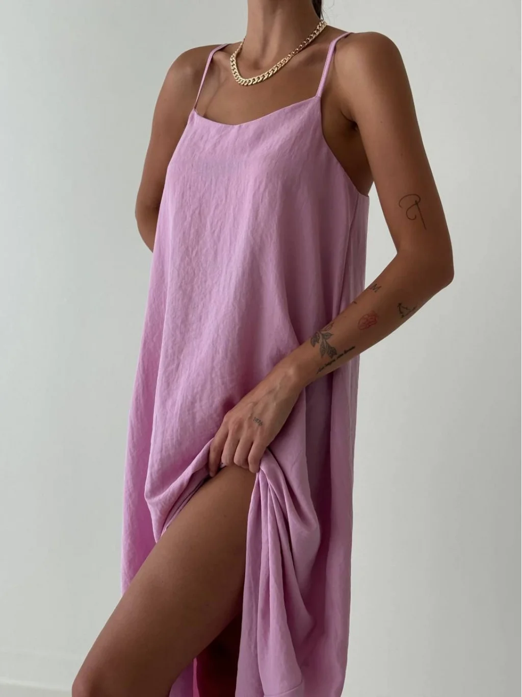 İNCE ASKILI UZUN PEMBE KETEN ELBİSE