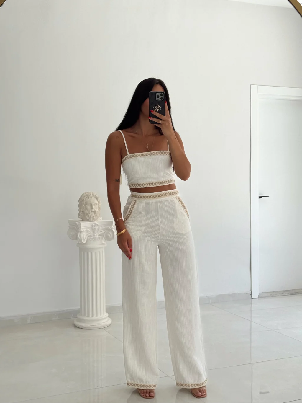 • MYRA İşleme Detaylı Keten Pantolon-Ekru, şıklığı ve rahatlığı bir arada sunar.